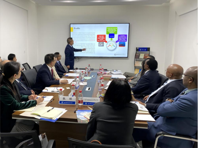 随后,金砖国家研究院经贸财经研究所所长谌华侨从发展历程、组织架构、研究团队、所获成就、未来规划等方面向谢胜文大使一行介绍了我校金砖国家研究院的相关情况。他表示,希望大使先生能够支持研究院的南非国别研究,帮助搭建川外与南非高校及研究机构的合作关系,同时协助推动双边及金砖青年人文交流。