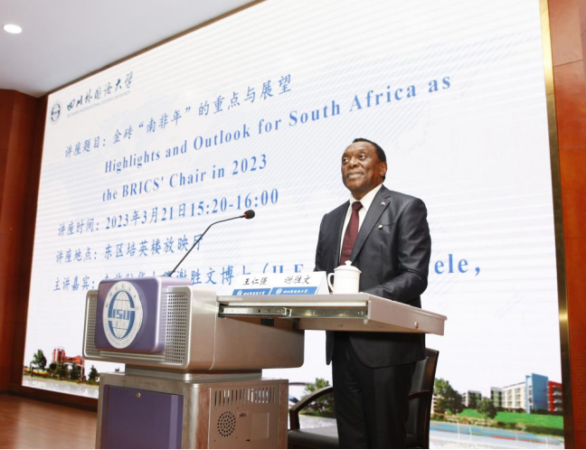 座谈结束后,谢胜文大使以“金砖‘南非年’的重点与展望”为题向学校师生发表了演讲。他简要概述了金砖国家伙伴关系及其合作机制的发展历程、南非担任2023年金砖国家轮值主席国期间的优先事项和金砖机制扩员等方面的情况。