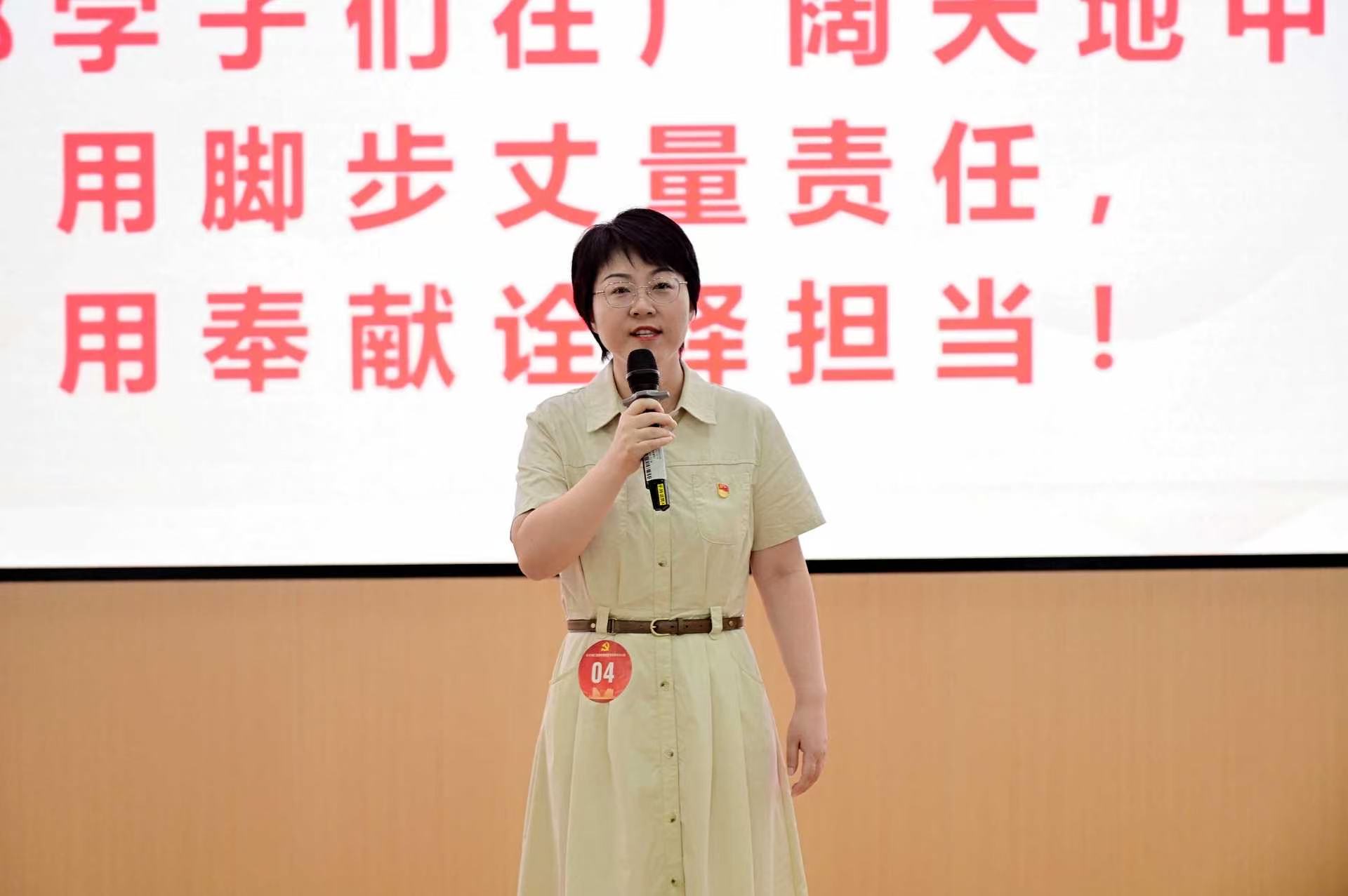 在基础知识测试环节,两位书记凭借扎实党务知识功底脱颖而出。在淘汰半数参赛者的赛制下,二人成功晋级下一环节。在理论宣讲环节,潘庆以《做远行者,上新时代的“春山”》为题,从三个学生远赴非洲推动文明共美、助力重庆企业出海远航、扎根基层诠释奉献担当的案例入手,引领大学生牢记习近平总书记的殷殷嘱托,成为文明的传播者、时代的弄潮儿、民族的脊梁骨。杨希以《以语言为桥 向世界传声——新时代外语教育工作者的使命担当》为题,从七十五载红色育人根基铸就、中青代育人使命接力践行、以专业能力服务国家战略三方面切入,借助川外老中青三代俄语人教育教学案例,生动呈现教育家精神实质与传承。在现场答辩环节,两位党支部书记运用过硬的业务能力,全面准确分析了党支部工作实际案例,赢得了现场评委的高度认可。其中,潘庆在理论宣讲和现场答辩环节均获得了全场第二的高分。