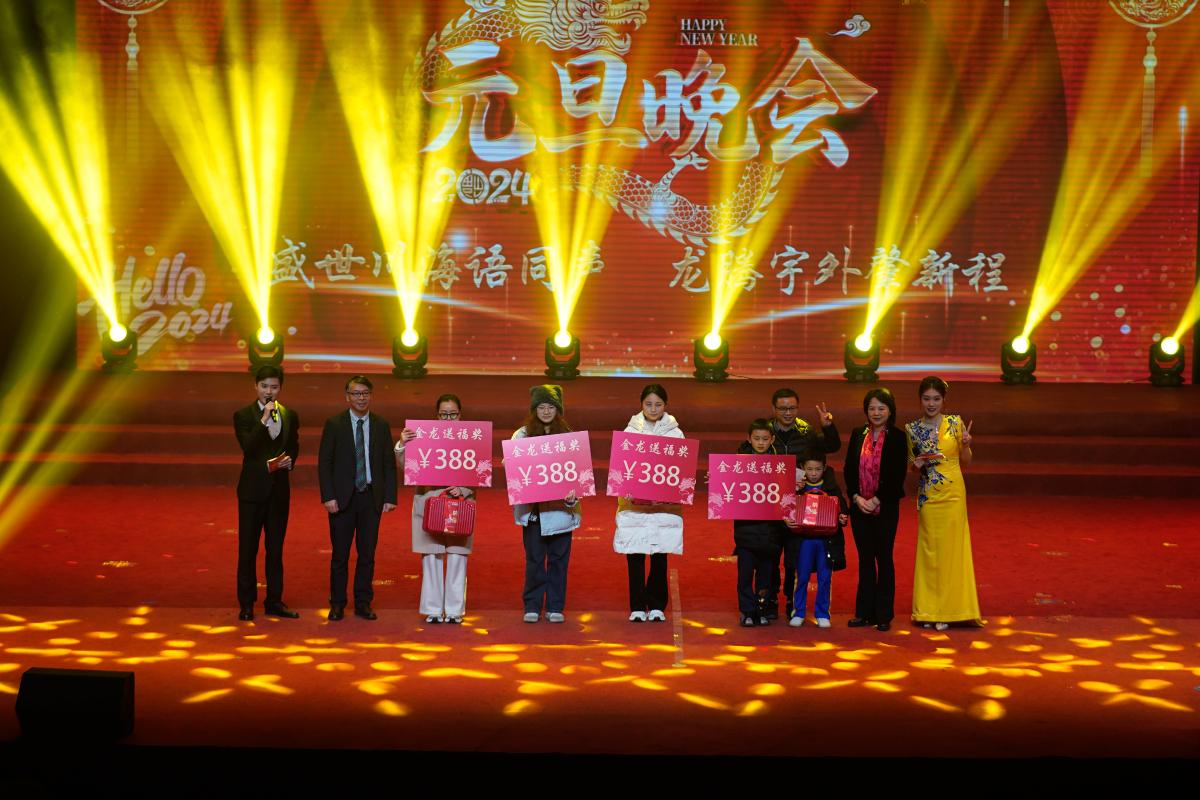 晚会之启,笙歌鼎沸,重庆理工大学大学生艺术团龙狮分团、校国际文化交流大学生艺术团、川外附小以及教职工子女的《辰龙纳福迎新岁》为整场晚会营造了欢乐喜庆的氛围,叩开了2024年辞旧迎新的大门。