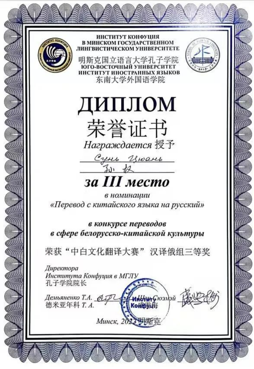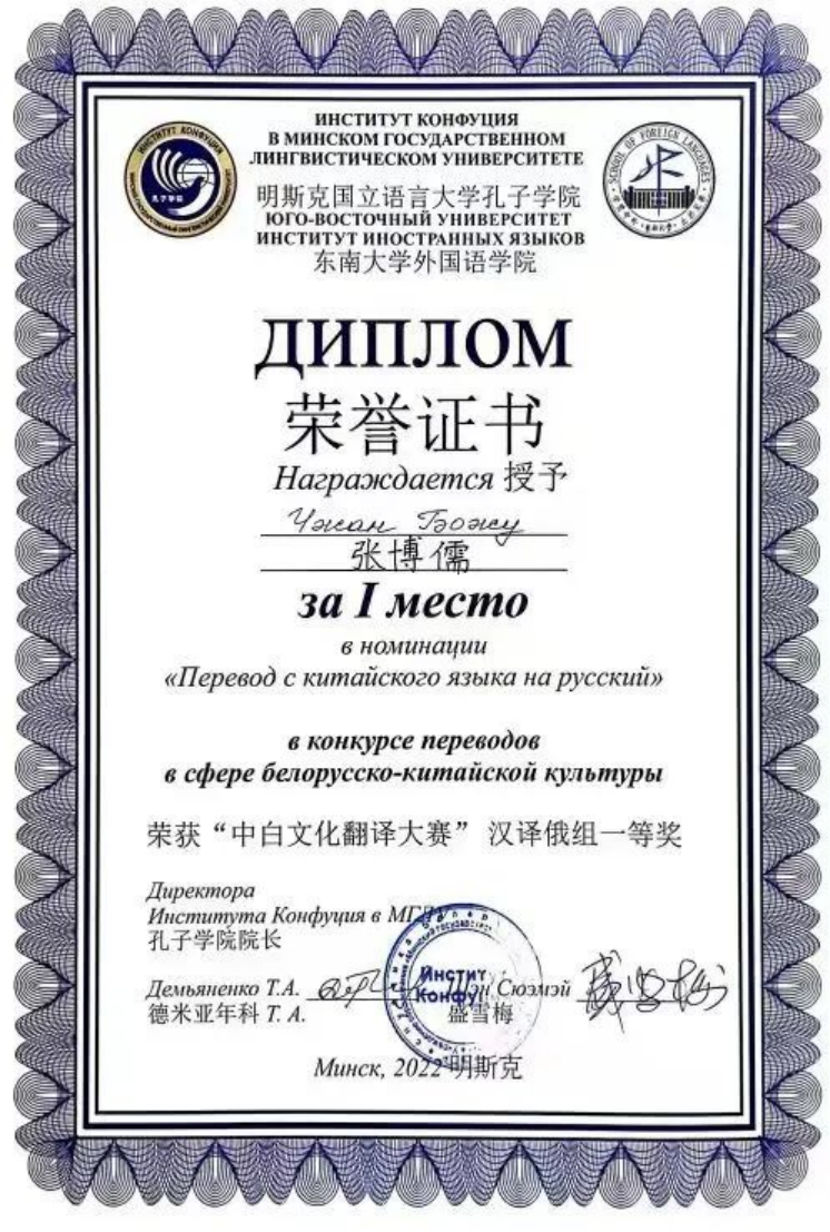 2022年5月18日,“中白文化翻译大赛”落下帷幕,共有来自中国和白俄罗斯300多所高校的400多名学生报名参加了此次比赛,四川外国语大学俄语学院2021级研究生张博儒和孙权分别在比赛中获得一等奖和三等奖。