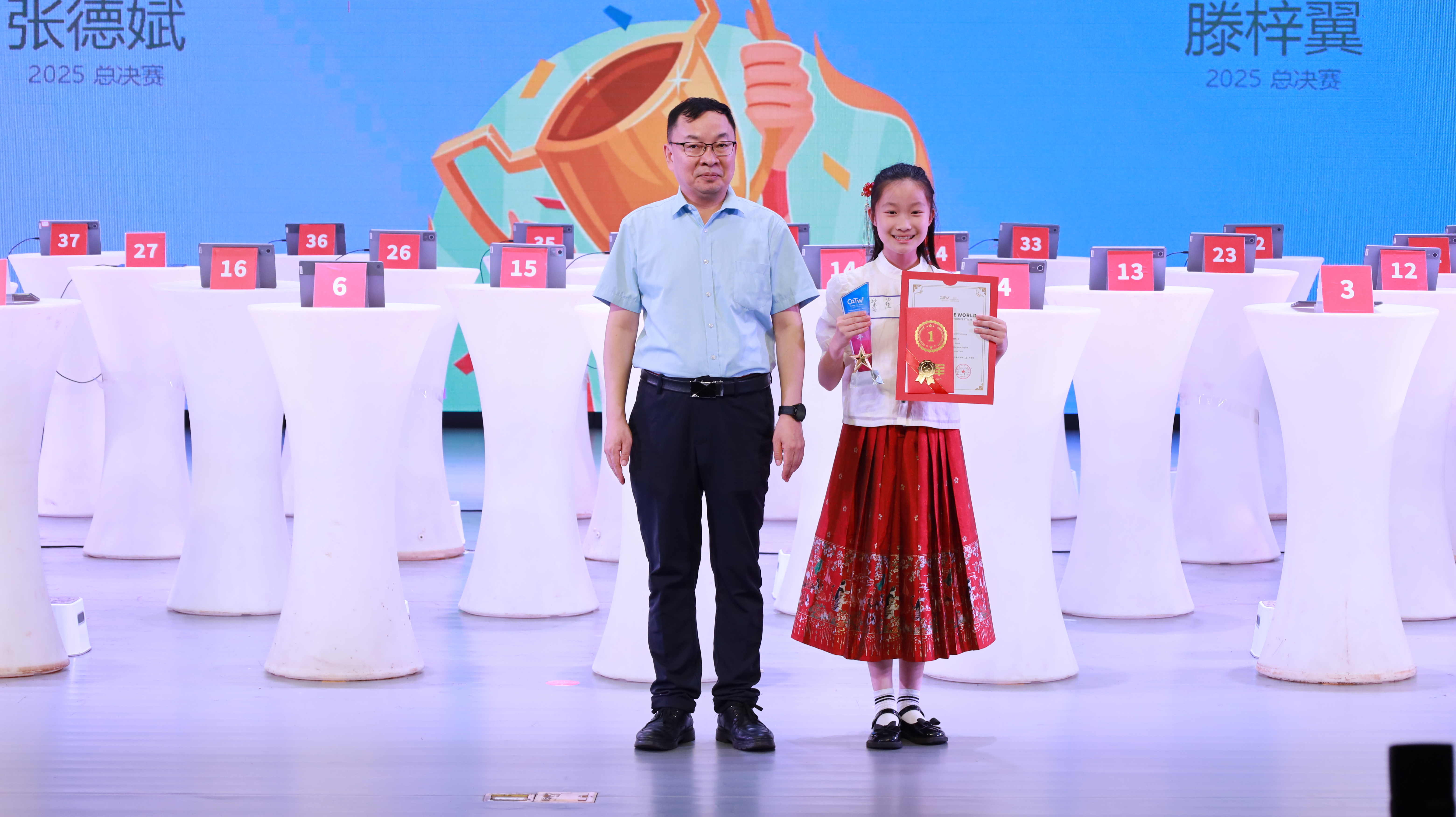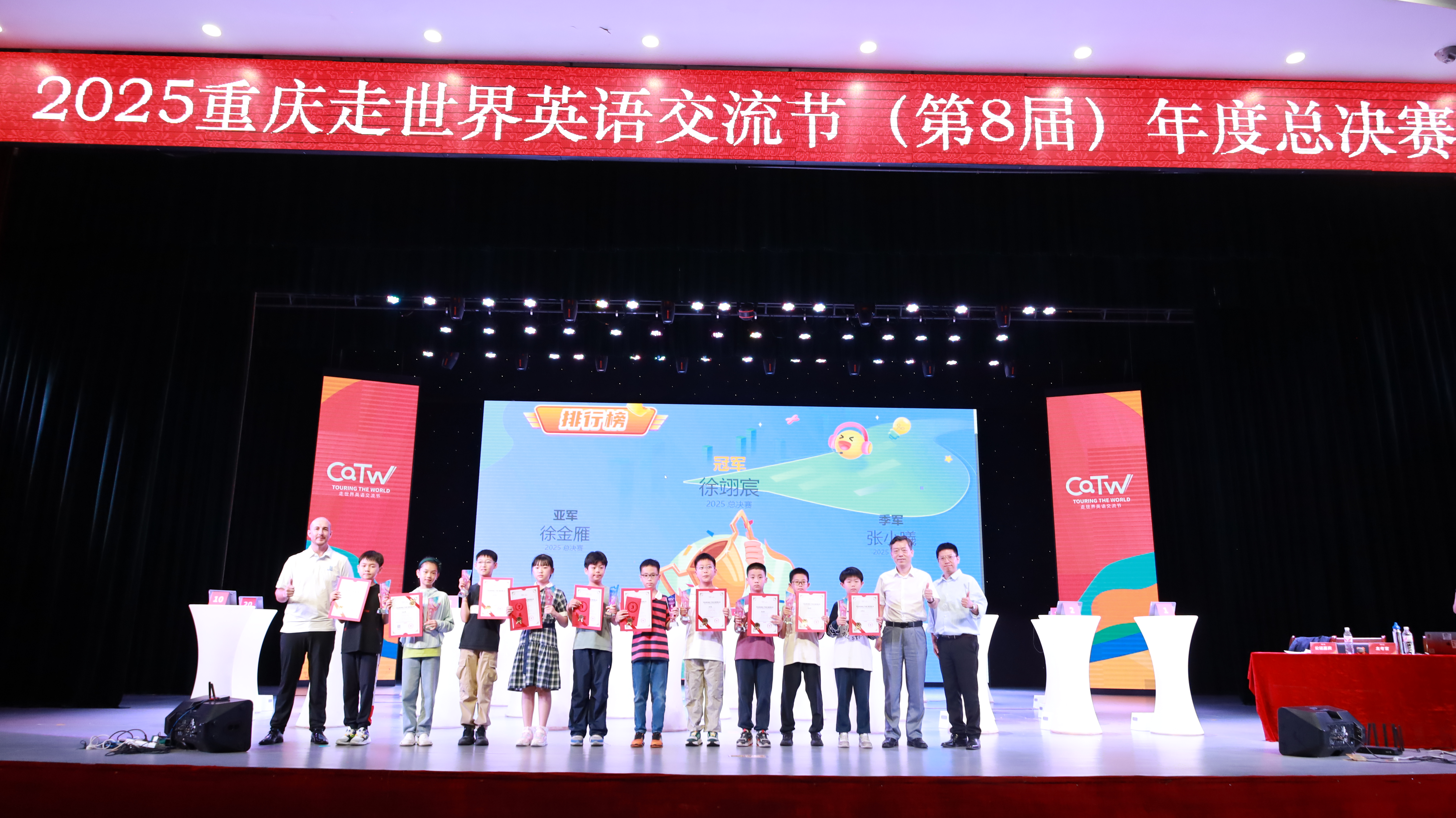 经过小组赛、晋级赛、半决赛、决赛四个环节的激烈比拼,产生了四、五两个年级的前十和前三名。四年级组冠、亚、季军分别是徐诩宸、徐金雁、张小曦;五年级组冠、亚、季军分别是李佳一、张德娬、滕梓翼。英语学院院长赵永峰为获奖选手颁奖,鼓励全体参赛者以赛事为起点,持续提升综合素养。