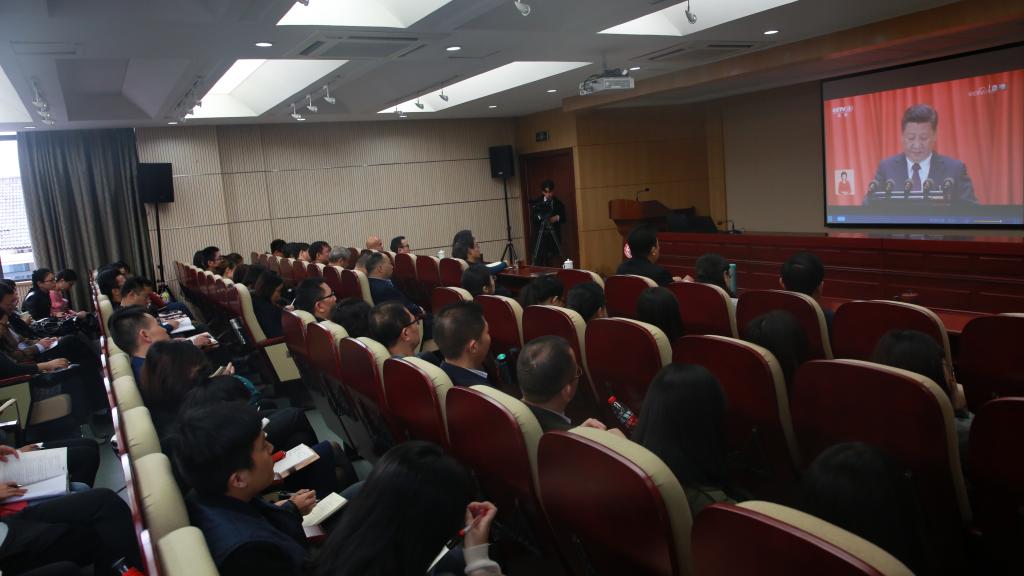 今天上午9时,中国共产党第十九次全国代表大会在北京隆重开幕,四川外国语大学组织全校师生分别在在东、西两校区的会议室、办公室、教室以及我校附中的会议室,共24个地点,通过电视、网络等集中收看十九大开幕会直播,师生反响热烈。在西区办公楼A609报告厅,全体在家校领导:党委书记明国辉,校长李克勇,纪委书记聂志强,副校长李彦、郑白玲、祝朝伟、张季菁,各职能部门、院系负责人及师生代表近两百人集中观看了十九大开幕会盛况,聆听习近平总书记代表第十八届中央委员会向大会所作的报告。