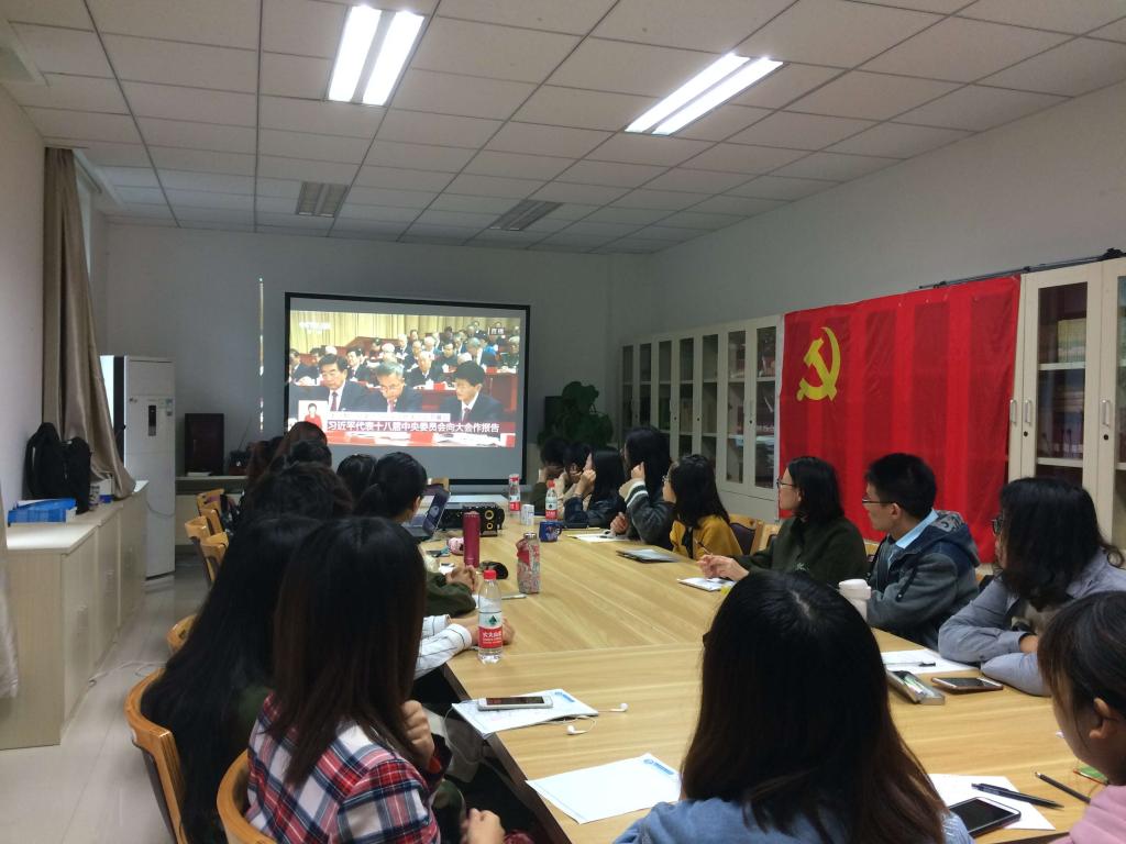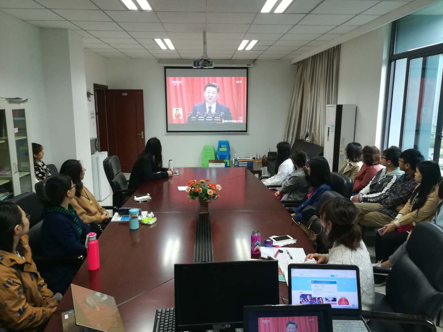 在十九大召开前夕,我校通过党委理论学习中心组学习、党支部主题党日活动,“迎接十九大胜利召开,党员领导干部党性教育”活动,召开“学习习近平总书记系列重要讲话喜迎十九大”座谈会,官方微信推送“十九大热词”翻译等方式宣传十九大,形成了全校师生关注十九大、喜迎十九大的良好氛围。今天上午,各院系学子也分别利用课间集中观看十九大开幕会,翻译学院学生还在聆听习近平总书记做十九大报告的同时模拟现场交传,进行专业实训。