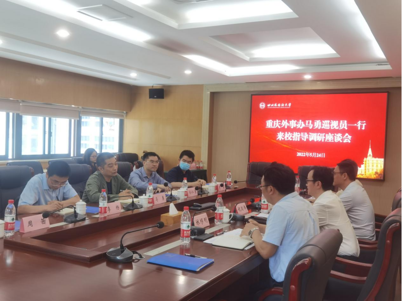 2022年5月24日,重庆市人民政府外事办公室二级巡视员马勇一行到四川外国语大学调研,在行政楼A栋三楼会议室召开了座谈会。会议由祝朝伟副校长主持,市委外办秘书处处长冯仁勇、市委外办秘书处干部李杨、贾雷、周茜以及我校国际合作与交流处副处长朱天祥、国际法学与社会学院院长林移刚、教师蒋亚丽和部分研究生代表参加了本次座谈。