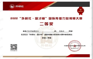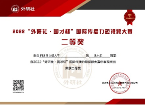 近日我校英语学院黄静怡、朱沿颖、徐子言、吴文婧和石先玲五位同学组成的“我为5G代言”团队在魏涛老师指导下制作的短视频作品《5G远程医疗》从国内高校9000余名选手制作的包括英、德、法、日、西、葡、意、韩、阿、俄等15个语种的4000余份作品中脱颖而出,获得“2022外研社•国才杯国际传播力短视频大赛”全国二等奖。