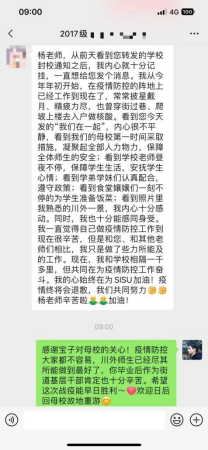 徐亮老师分享所看见的志愿行动,所感受到的志愿者精神:“我身边的志愿者们用他们决绝、坚强、勇敢和具有担当的精神深深地打动和鼓舞着我。从给学生派送一日三餐,到冒着斜风细雨为楼栋里的居民做核酸检测提供帮助和服务,他们勇敢地奋战在抗疫的第一线,用温暖的微笑、话语和行动鼓舞着疫情中的每一名川外人。作为一名教师,我的本职工作是教书育人,通过微信等方式向同学们传递了自己的关心和挂念,鼓励同学们积极配合学校工作,师生共同战胜疫情!同学们,相信我们很快就能在宽敞明亮的教室相见!”