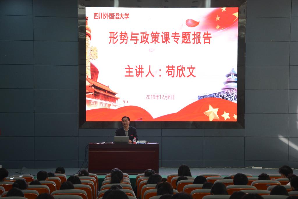 12月6日下午,党委常委、纪委书记苟欣文为大学生作题为《把握制度优势,坚定“四个自信”》的形势与政策课专题报告。商务英语学院、中文系、法意语系、日语系、德语系和教育学院的师生聆听了此次报告。