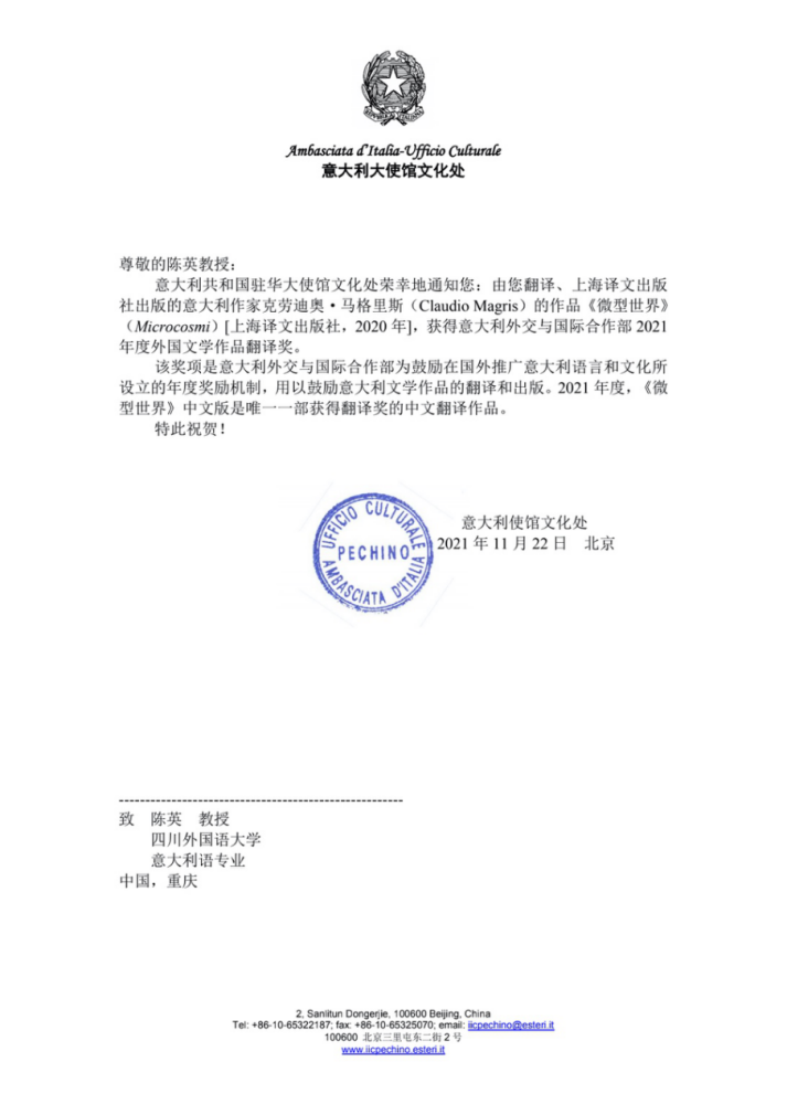 近日,我校西方语言文化学院意大利语专业陈英教授获意大利大使馆文化处正式通知,陈英翻译的意大利作家克劳迪奥·马格里斯(Claudio Magris)的作品《微型世界》(Microcosmi),获得意大利外交与国际合作部2021年度外国文学作品翻译奖,也是国内2021年唯一一部获得此项奖励的中文翻译作品。据悉,今年意大利外交与国际合作部在全球只颁出五个翻译奖,奖励了法语、英语、西班牙语、德语和汉语翻译作品各一部。