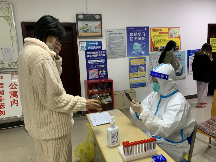 在学校组织部的统一调配下,崔老师被分配在了核酸采集小组,成为一名“大白”,配合专业医生负责对指定的宿舍楼的同学们进行身份扫码。由于志愿者只能睡在办公室或教室,崔老师从接到任务起,就匆匆地收拾了自己的行李,给外婆交代好了接下来的生活安排,也给还在附小上二年级的女儿檬檬叮嘱好了网课的一些电脑软件操作,就在女儿不舍的哭声中离开家门,住进了志愿者的统一楼栋。他快速地学习采集扫码软件的使用,跟专业医生学习防护服的穿脱流程。因为要面对数量巨大的采集人员,以及可能潜在的危险病毒,防护服的穿戴是有极其严格的标准和流程的,特别是脱下的时候,每一个动作都有先后顺序,都要严格消毒。学习并掌握后,崔老师就和同组的搭档医生在学校的统一安排下开始了每天的检测任务。有时候统一分配的任务采集完成,还要在工作组的安排下去办公楼给一些密接的同事进行上门单采。从敲开隔离的同事的办公门,到完成扫码,医生采集标本,到配合医生封好标本,收拾好医废材料,再把标本送给转运组,每一个动作都要求必须谨慎专业,严谨仔细,不能出一丝意外。在出征前的志愿者大会上,工作组就反复强调,顺利完成采样工作的同时,确保我们的志愿者队伍零感染,也是重大胜利。