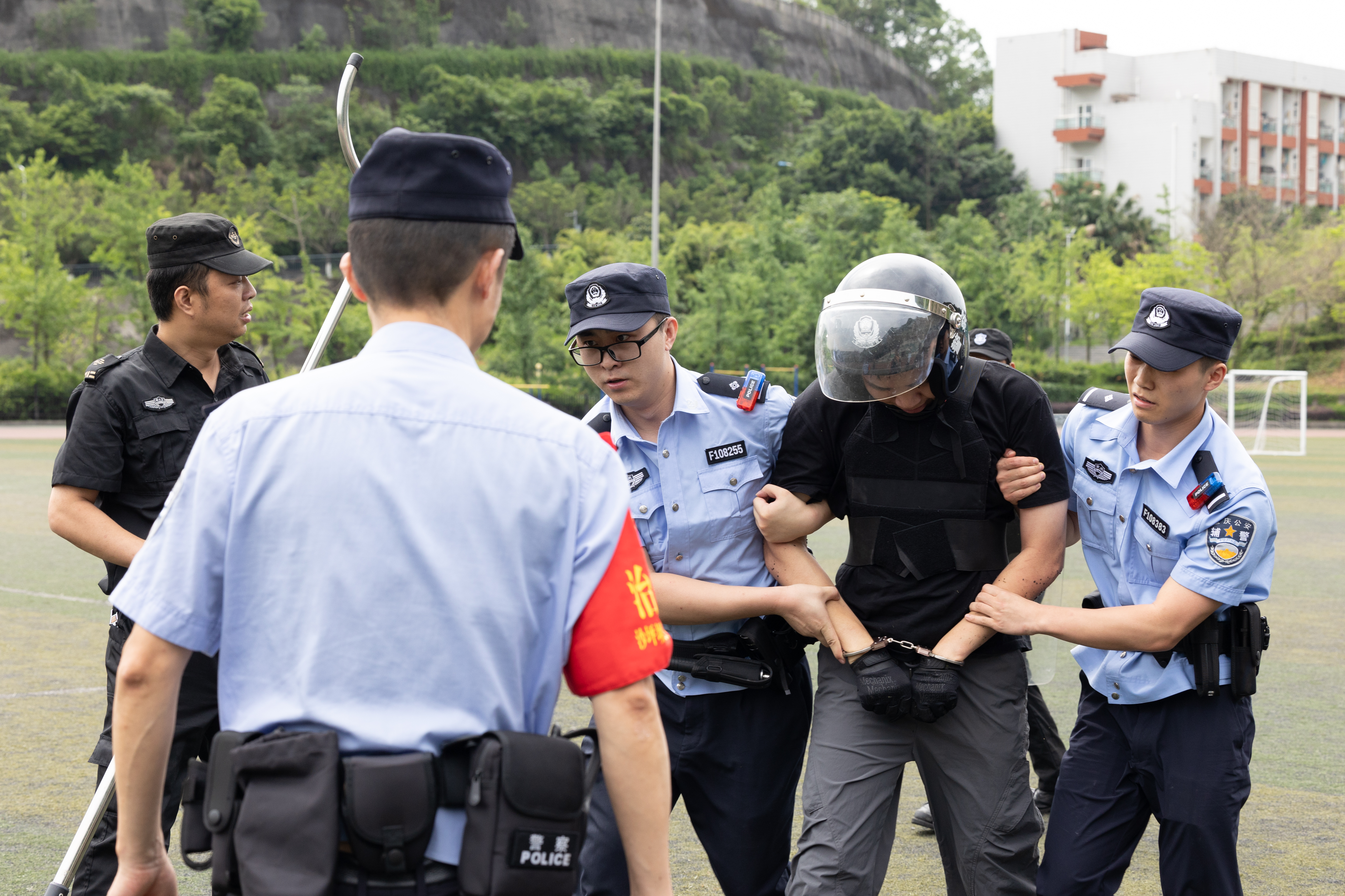分局指挥中心接警后按照反恐防暴应急处置预案迅速出动警力抵达现场处置。特警、派出所民警与校园安保人员密切配合,利用战术队形对“歹徒”进行包围。经过短暂对峙,特警果断出击,用专业防暴技能将“歹徒”成功制服,由派出所民警将其带离现场,整个过程高效稳妥,最大限度地降低了潜在风险。