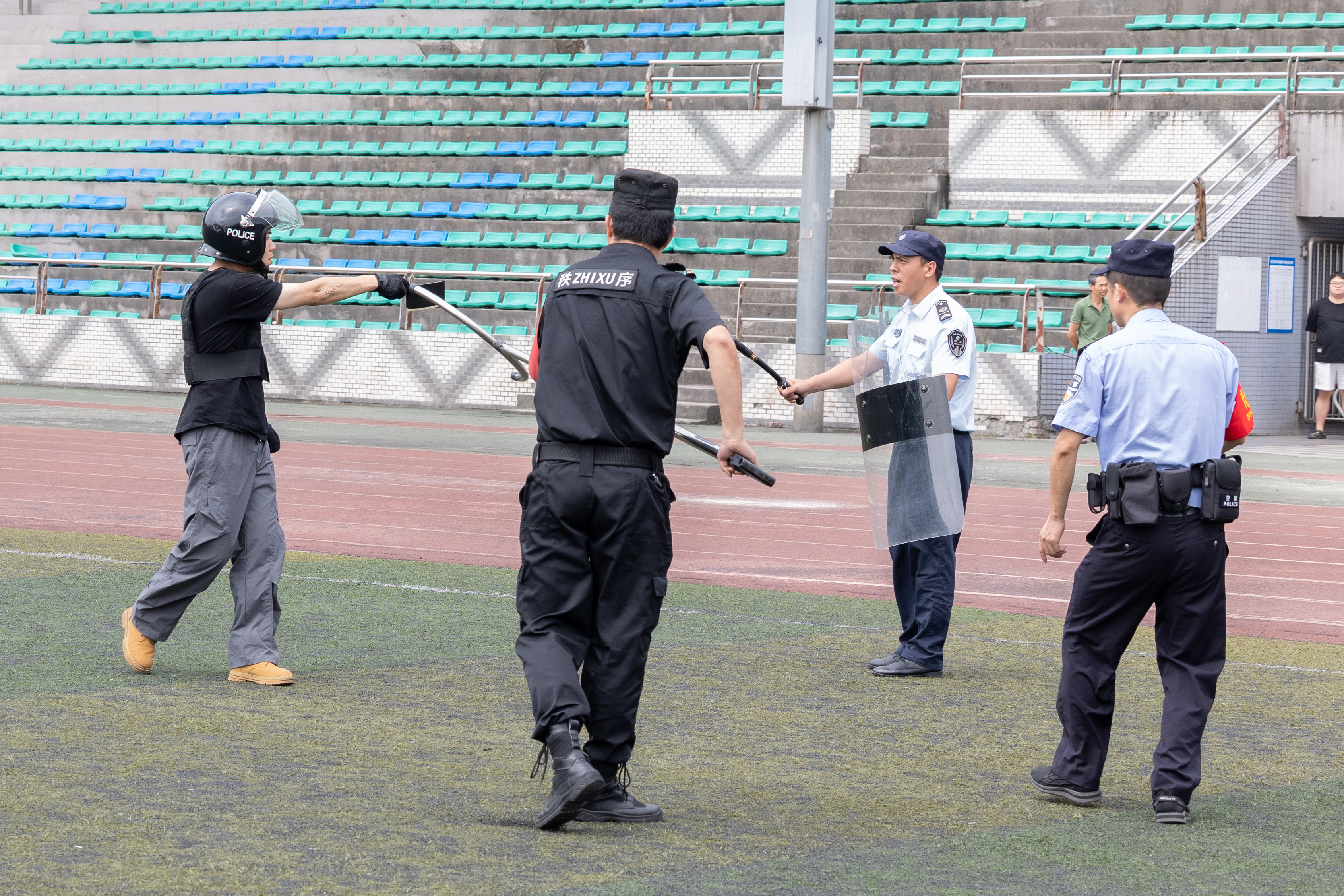 学校应急指挥中心接到校大门保安报警,迅即启动应急处置预案,校园安保“最小作战单元”快速携带防暴器械赶往现场并形成第一道防线,与“歹徒”展开周旋,阻止其进一步扩大威胁范围。