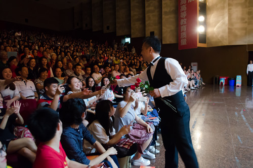歌唱家秦侃如、金久湝、王威、王立民、韩鈞宇、耿哲等轮番出场为大家献唱了《霍夫曼的故事》、《风流寡妇》、《弄臣》等歌剧的选曲,其中由刘怡然、韩钧宇带来的《图兰朵》选曲“今夜无人入睡”更是将现场气氛引向高潮。一曲结束,掌声雷动。每位歌唱家演唱结束后,来自校大学生艺术团的学生代表都热情地献上鲜花,并与他们热情拥抱。