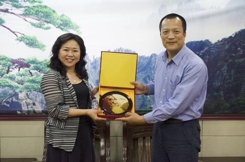 郑白玲副校长(左)向中央歌剧院赠送具有重庆特色的礼物“山城漆器”
