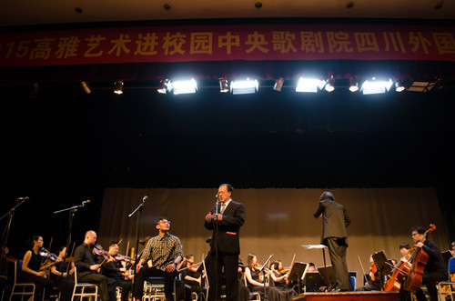 6月4日晚,2015年高雅艺术进校园——中央歌剧院歌剧经典音乐会专场演出在我校东区大礼堂举办。本场演出由中央歌剧院歌剧团,中央歌剧院交响乐团及四川音乐学院交响乐团共同打造,副校长郑白玲和师生们共享了这场视听盛宴。