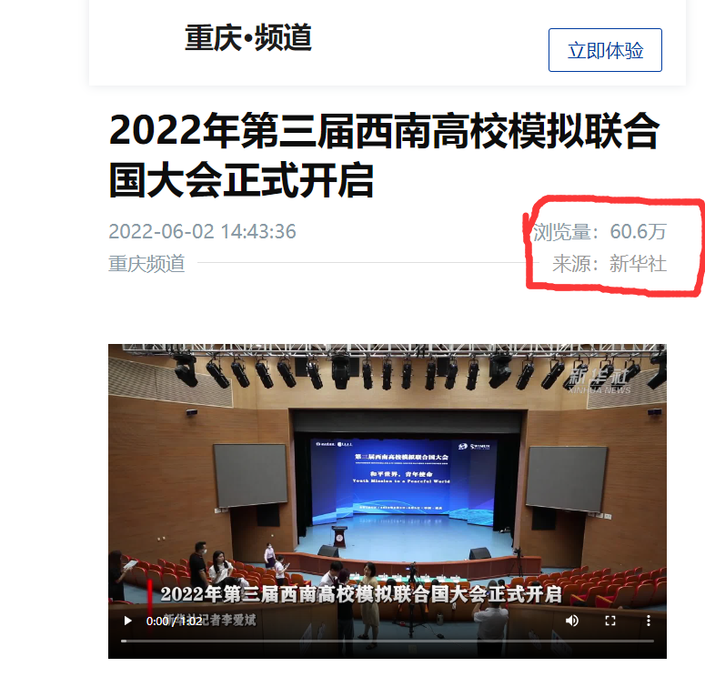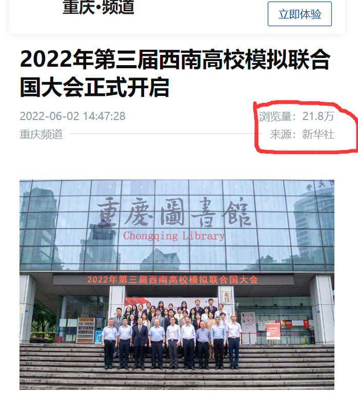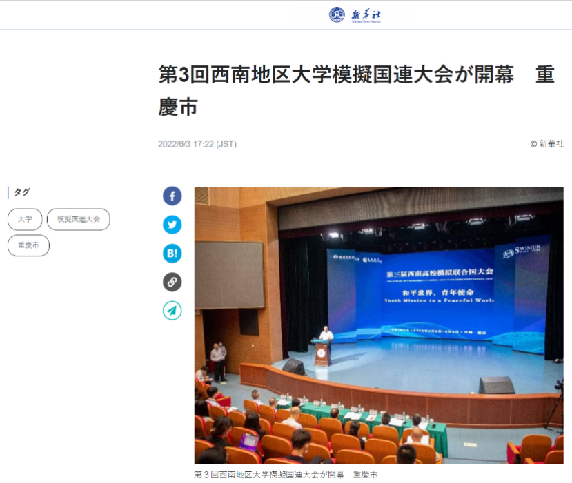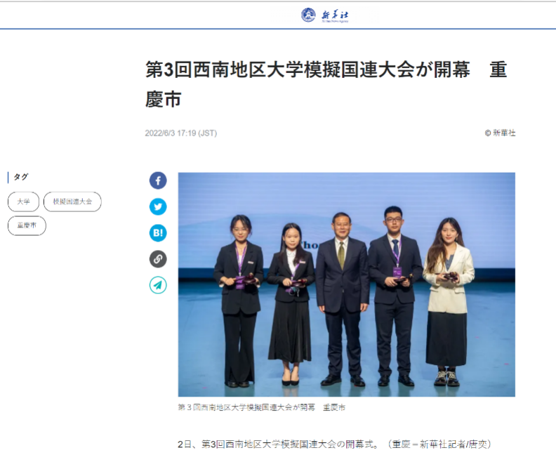 本届西南高校模联大会引起了多家重磅媒体的广泛关注和报道,其中新华社的报道阅读量突破82万(截至2022年6月8日),新华社日本分社“日本专线”特别对本次西南高校模联大会开幕式进行推介,向日本国内青年传播中国青年关于促进全球合作与繁荣的声音。除了新华社、中国日报网、中新网等全国性媒体,重庆日报、重庆市高等教育学会官网、重庆市外事办公室也对本次大会进行了报道,产生了广泛的社会反响。从整体来看,媒体对本次活动的报道对于我校高水平新文科特色高校和国际化特色高校建设,特别是国家急需国际组织人才培养知名度的提升,都产生了极大的正面宣传作用。