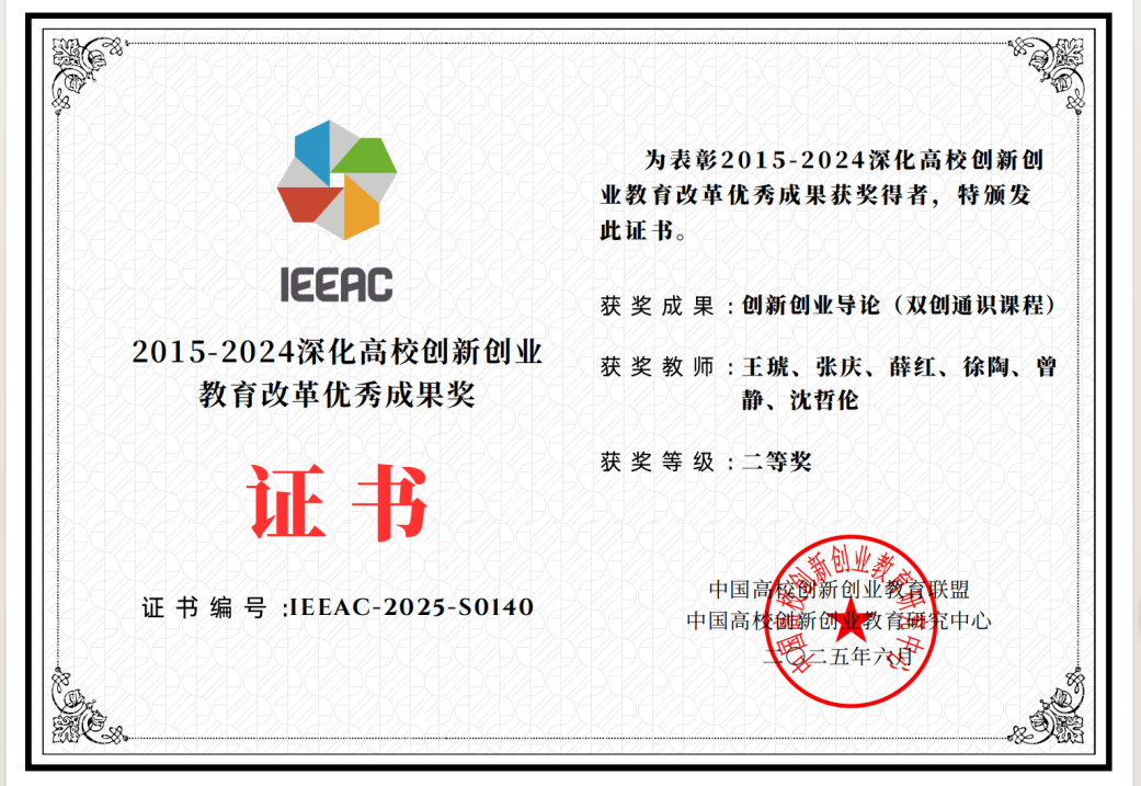 6月17日,中国高校创新创业教育联盟公布了2015—2024年深化高校创新创业教育改革优秀成果评审结果,我校双创示范课“创新创业导论”课获得优秀课程二等奖。