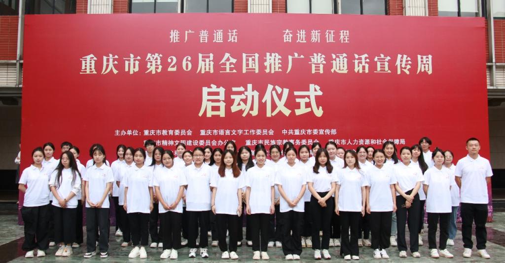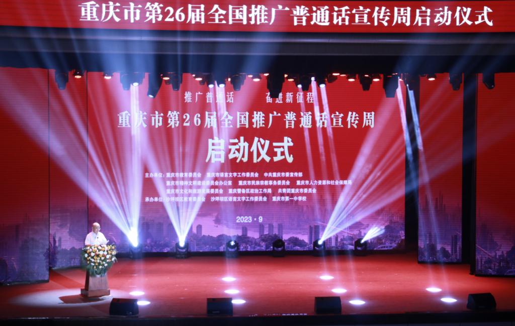 9月12日下午,重庆市第26届全国推普周启动仪式暨现场展演活动在重庆一中艺术楼礼堂举行。此次活动由重庆市教育委员会、重庆市语言文字工作委员会、中共重庆市委宣传部等有关单位主办,沙坪坝区教育委员会、沙坪坝语言文字工作委员会、重庆市第一中学校承办。