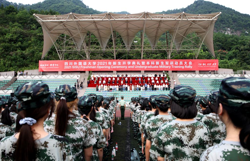 邹渝向军训团授“四川外国语大学学生军训团”团旗,大会在四川外国语大学校歌中结束。2021级新同学将在为期半个月的军训中锤炼意志,开启大学生活新篇章!