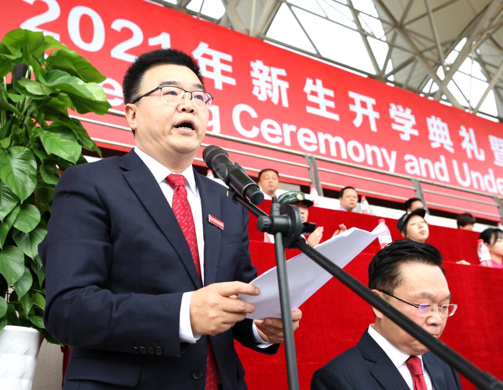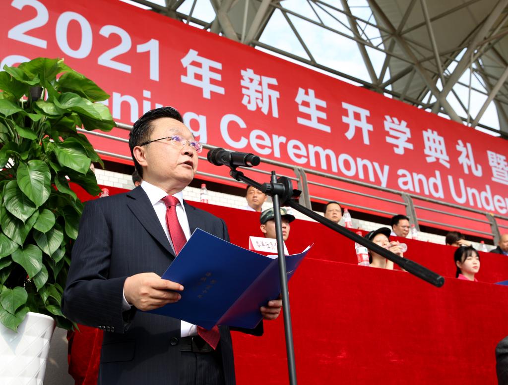 “川外校训‘海纳百川,学贯中外’的英文翻译是‘Global Vision,Academic Excellence’,Global Vision就是国际视野,你站的有多高,就能看得有多远,远见决定‘遇见’”。董洪川在讲话中寄语全体新生。他回顾了2021年对国家、川外和新生而言的不平凡。他指出,新生们日夜坚持、努力、有理想,迈出了理想人生的重要一步。中国共产党的百年华诞,实现了第一个百年奋斗目标,当前世界也正历经百年未有之大变局,中华民族伟大复兴也正处于关键时期。川外要在70年办学成就的基础上乘势而上、固本开新、谋求发展,更好地担当起历史重任,建设特色鲜明的高水平应用研究型外国语大学。董洪川鼓励同学们努力做到三个“不虚度”:坚持课内学习不虚度,砥砺厚重的学养;坚持课余时光不虚度,积淀广博的涵养;坚持社会实践不虚度,累积过硬的综合素养!他深情祝福新同学:“希望你们在川外不要虚度学习时光,不负韶华不负心,不负青春不负梦。今天,我们‘确认过眼神’,只要你志存高远、意志坚定、不懈奋斗,你们一定会拥有丰硕的秋天。”