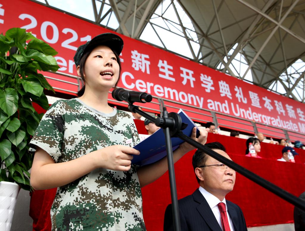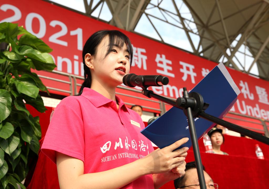 “何其有幸,我拿到了川外的通知书,成为了一名川外人,我与川外的故事,即将开始。典礼上,本科生新生代表、新闻传播学院2021级学生陈王婉钰发言,她分享了自己入学川外的喜悦,并号召全体新生:要做一个有志向的川外人、有志气的川外人、有志趣的川外人。