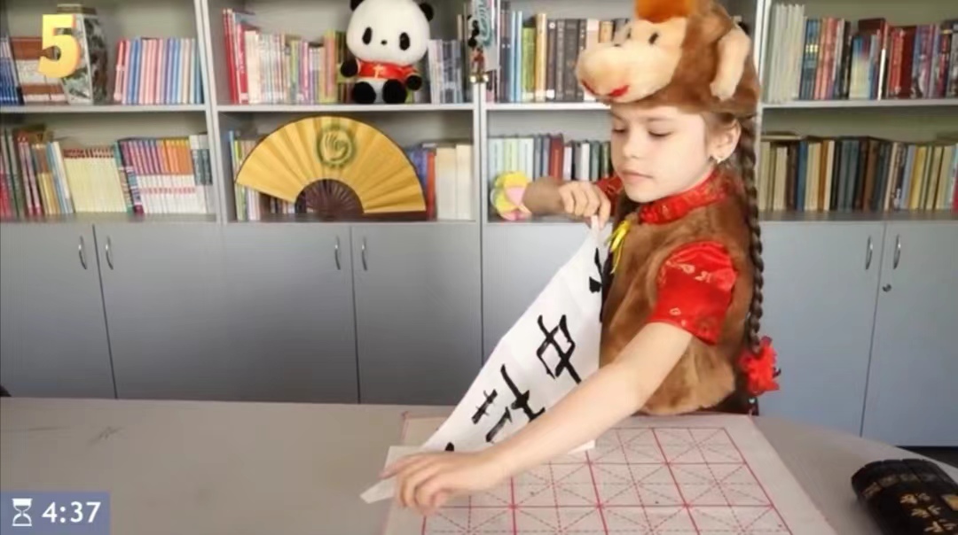下诺夫哥罗德国立语言大学孔子学院选手玛莎是小学生组年龄最小的选手,在中文秀环节中,她讲述了自己学习汉语的经历以及对汉语和中国文化的热爱,并用标准的中文句子介绍了图片内容。在才艺表演环节,小玛莎一边展示书法才艺,一边生动形象地讲述了“水中捞月”的成语故事。