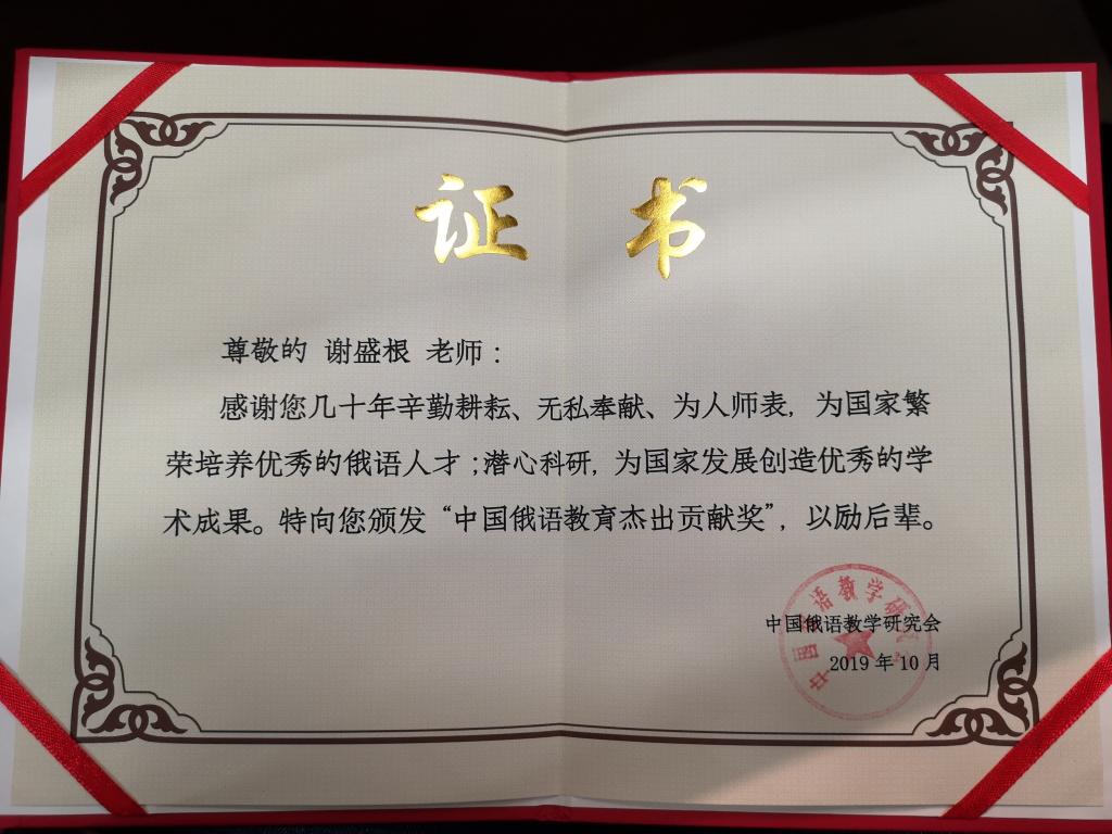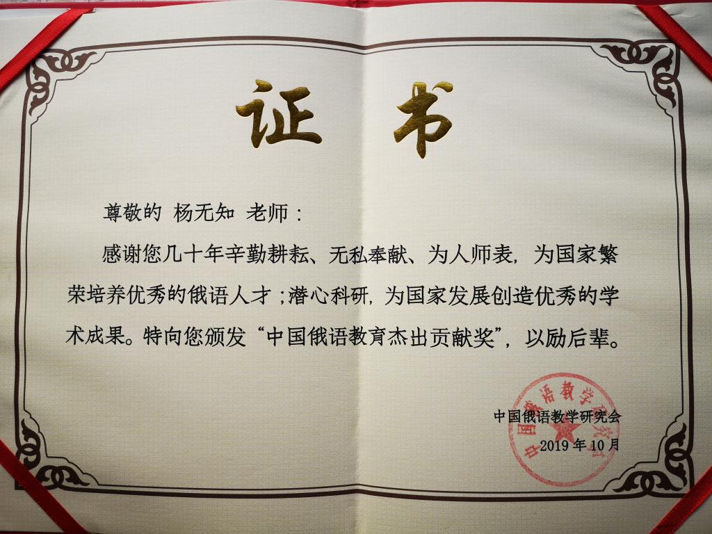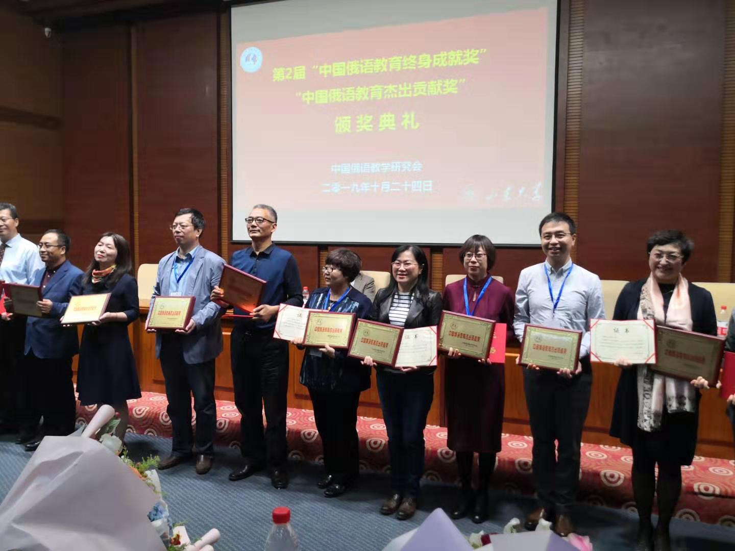 2019年10月23日-24日,第二届中国俄罗斯东欧中亚学会俄语教学研究会(暨第九届中国俄语教学研究会)会员代表大会在山东大学隆重召开。大会对27位德高望重、为中国俄语教育事业辛勤工作50年以上的前辈学者进行了表彰,我校俄语系杨无知教授和谢盛根教授荣获中国俄语教育杰出贡献奖。