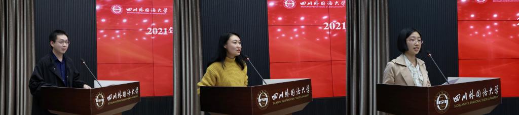 活动第二阶段是新进教师代表发言。中国语言文化学院罗杰老师、国际教育学院郑东方老师和英语学院蒋展老师表达了培训的体会及收获。他们表示,将以川外为起点,继续在教书育人的道路上奋进。
