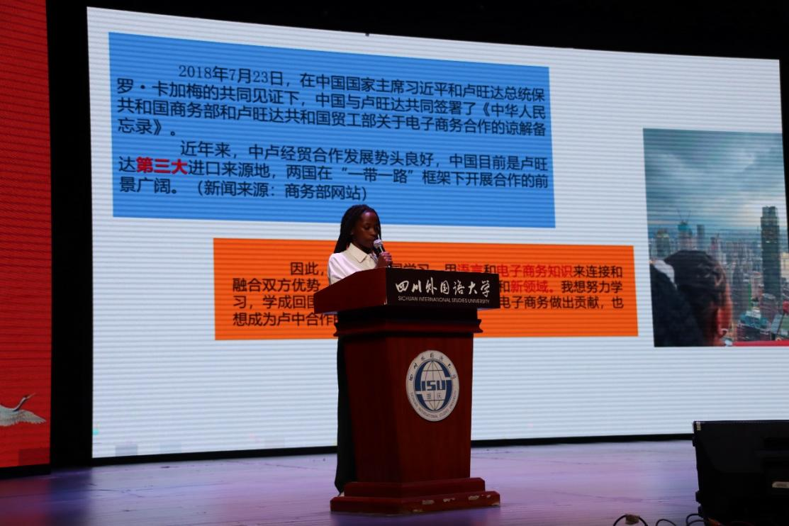 比赛展示环节中,伴随着视频和PPT,每位选手都热情饱满的讲述了自己未来的学业生涯规划,从英语教师到投身西部计划,从自我成长到一带一路,选手们个个从容自信,声情并茂,各具特色的讲述透露着当代大学生们对学业发展的展望,对理想的憧憬,对目标的渴望。面对选手和评委的提问,他们灵活多变的回答引得台下观众不时迸发出热烈的掌声。作为比赛的特别环节,来自国际工商管理学院电子商务专业的国际学生代表文彬也对自己在川外的大学学业生涯规划进行展示。她表示要扎根本专业发展,努力学习电商知识,计划回卢旺达从事电商运营,并为中卢两国密切联系做出贡献。