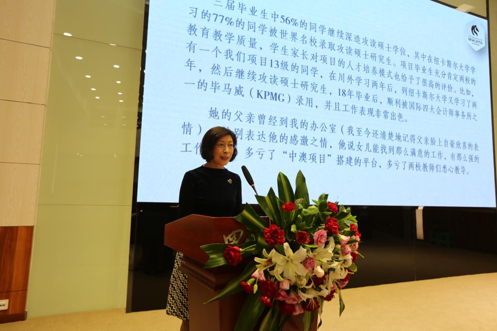Sally Chan教授致辞,从学校历史与背景,地理优势、学科优势、项目愿景等方面介绍了纽卡斯尔大学。她表示,十分高兴与川外建立合作交流关系,并鼓励同学们把握机会参加国际课程。她期待能在纽卡斯尔大学的校园与同学们再次相见。