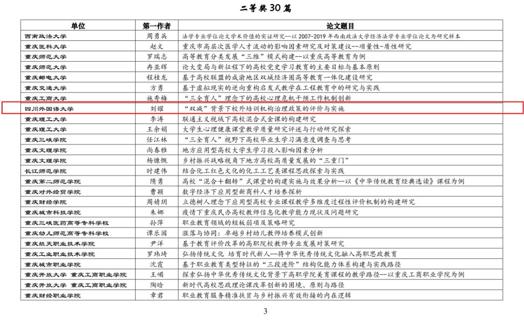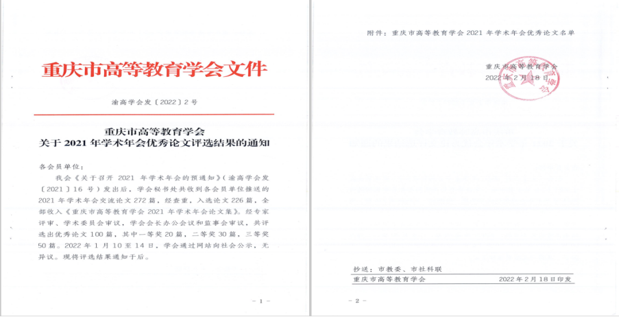 近日,重庆市高等教育学会发布了《关于2021年学术年会优秀论文评选结果的通知》(渝高学会发〔2022〕2号),我校国际教育学院刘耀撰写的论文《“双减”背景下校外培训机构治理政策的评价与实施》和教育规划与评估院王伟撰写的论文《新文科背景下外语人才培养和师资队伍建设》分获二等奖、三等奖。