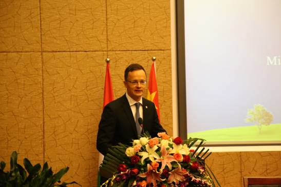 随后,西雅尔多部长在宏文楼国际报告厅以“匈牙利向东开放政策及中欧视角下的‘一带一路’倡议”为题进行了主旨演讲。西雅尔多部长演讲风格生动风趣,内容紧扣主题。他结合当前世界政治经济格局阐发了匈牙利务实的外交政策及向东开放政策,表达了与中国开展多边合作的良好愿望。他盛赞习近平总书记提出的“一带一路”倡议及刚刚在京举办的“‘一带一路’国际合作高峰论坛”所取得的成效,并表示将全力支持川外匈牙利语专业的发展。演讲之后,西雅尔多部长与我校师生代表就重庆如何在“一带一路”倡议的框架下结合匈牙利的向东开放政策实现合作共赢等问题展开互动交流。演讲活动由我校副校长祝朝伟主持,长达40分钟,在热烈而友好的氛围中圆满结束。