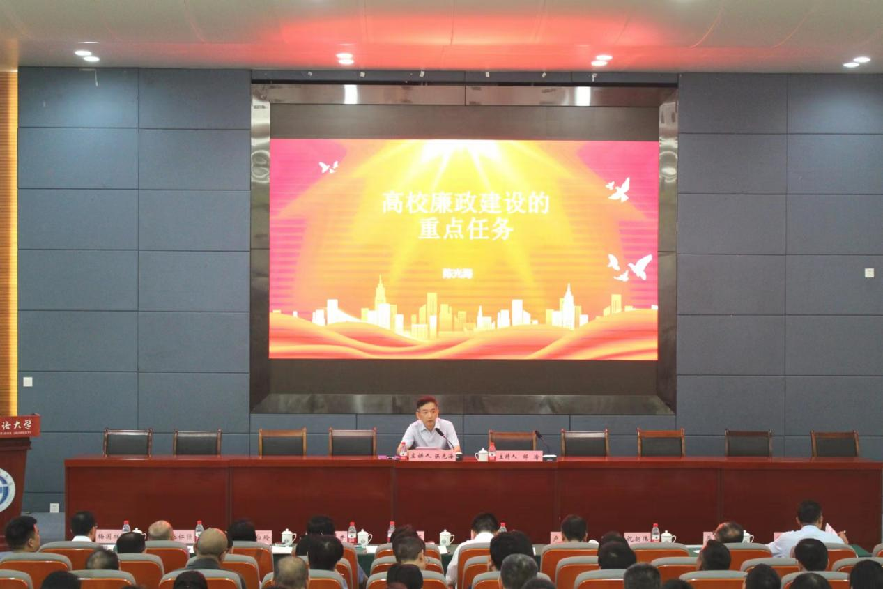 陈光海以《高校廉政建设的任务和形势》为题,从我市教育系统违纪违法典型案例切入,结合目前高校廉政建设存在的问题和不足,围绕“聚焦政治建设,提升政治素质;聚焦思想引领,筑牢意识形态安全屏障;聚焦监察改革,主动接受监督;聚焦作风建设,形成行动自觉;聚焦纪律建设,严守法纪底线;聚焦主体责任,层层分解落实”六个方面,引古论今,结合典型案例,对新形势下高校廉政建设重点任务进行深刻讲解。