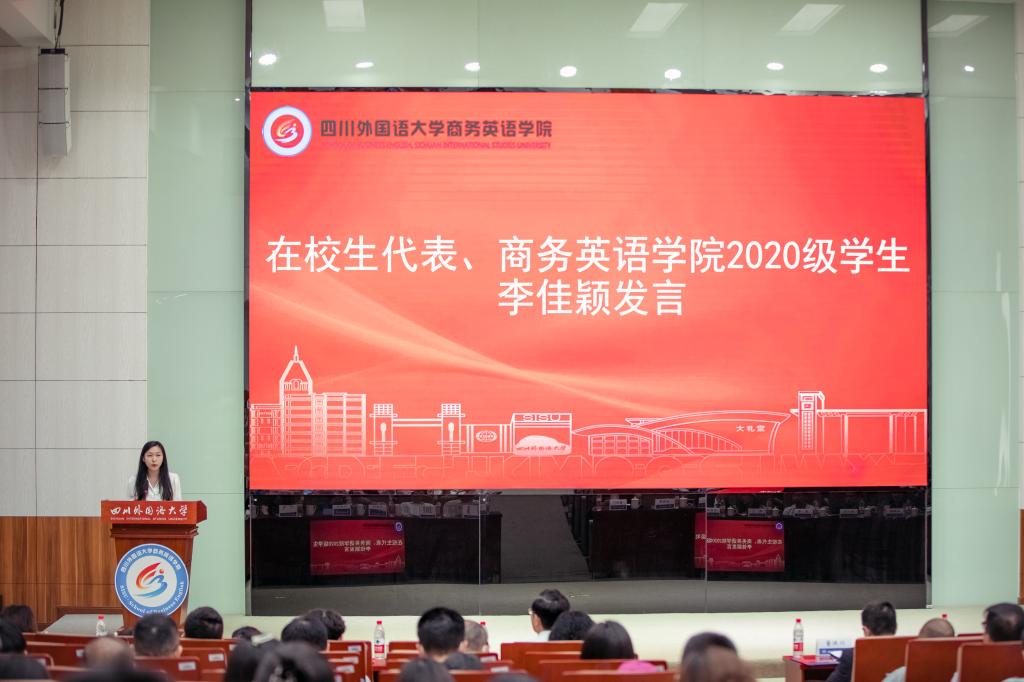 在校学生代表、商务英语学院2020级学生李佳颖代表川外商务英语学院全体在校学生向川外商英十周年的生日送上诚挚的祝福,并分享了川外商英对她以及全体同学们的倾力培养、拓宽的视野和素养。优秀校友代表吴玥感谢川外商英的教授、讲师的栽培。她表示,川外商英的四年旅程是她在工作生涯中披荆斩棘、过五关斩六将的勇气之源,这段旅程教会她认真专注、勤奋踏实,助力她取得如今在工作领域的成就。