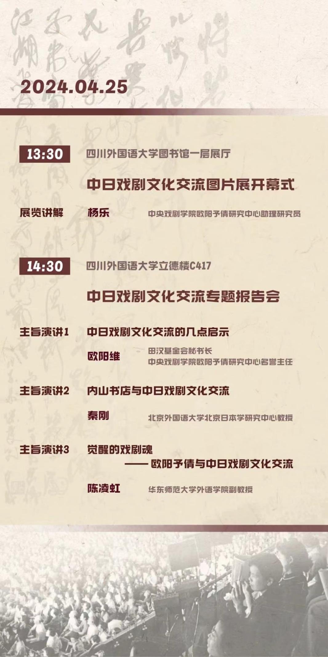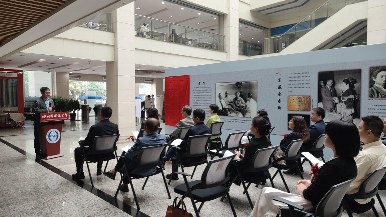 4月25日,“吾侪当致力于搭桥之功夫”—— 欧阳予倩・田汉与中日戏剧文化交流图片展在四川外国语大学图书馆一层展厅开幕。本次图片展由四川外国语大学日语学院、北京大鸾翔宇慈善基金会、田汉基金会联合举办,展期为一个月。四川外国语大学党委副书记苟朝莉、田汉基金会秘书长欧阳维为本次展览揭幕。