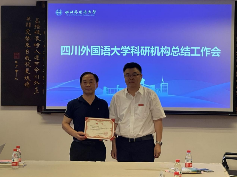 王仁强副校长首先宣读了中外文化比较研究中心、国别经济与国际商务研究中心主任和副主任的聘任决定。在随后当代中国研究院研究员的聘任仪式上,董洪川校长为当代中国研究院首席研究员苟欣文教授颁发了聘书。