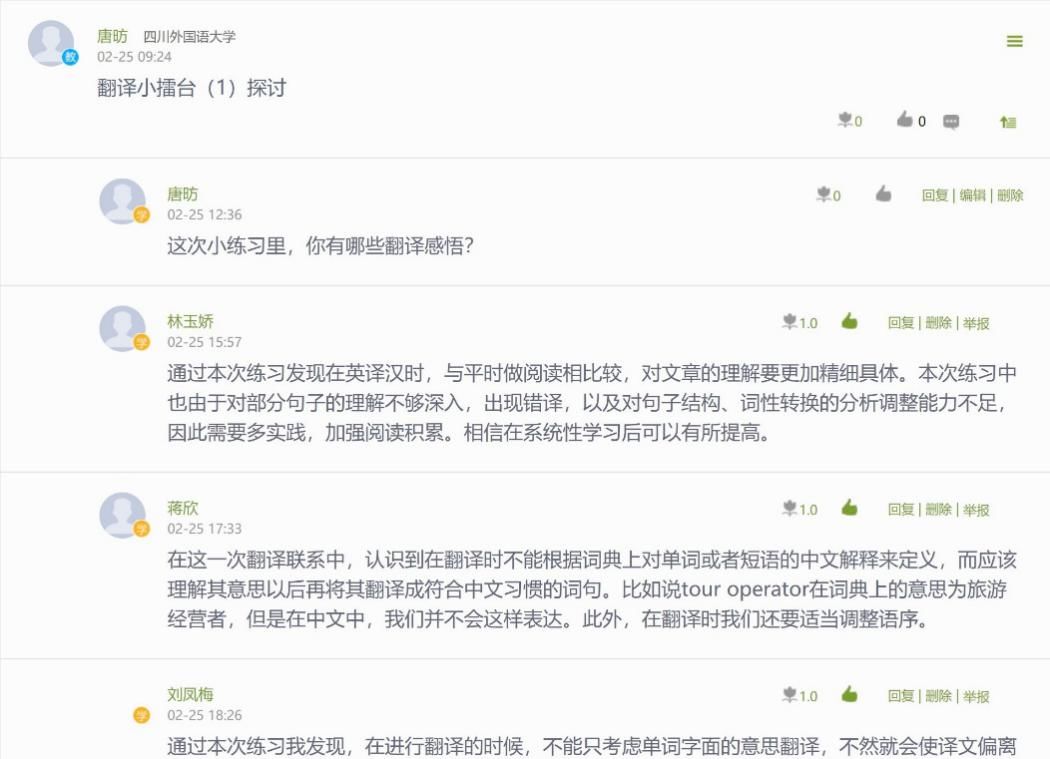 学校翻译学院唐昉老师说,这次教学模式的转变让我深深感到线上教学并不单单是课堂教学的网上直播,更需要教师从知识的提供者转变为学生学习的指导者,充分利用已有优质慕课资源,实现多样化优质教学资源与学生个性化学习结合。比如针对《英汉笔译》课程,我给不同学习需求的同学分别推荐线上拓展学习资源:希望系统学习的同学浏览《翻译有“道”》慕课;偏爱影视歌曲翻译的同学加入《趣味英语与翻译》慕课;想要参加翻译资格考试的同学在《CATTI翻译资格考试笔译备考基础》慕课平台强化训练。通过学习通+QQ群结合的模式,开展签到、音视频播放、讨论、答疑、测验等活动。虽然无法面对面讲授,但每一次的提问反馈,每一次的互动讨论,都能感觉到同学们的积极投入与专注。