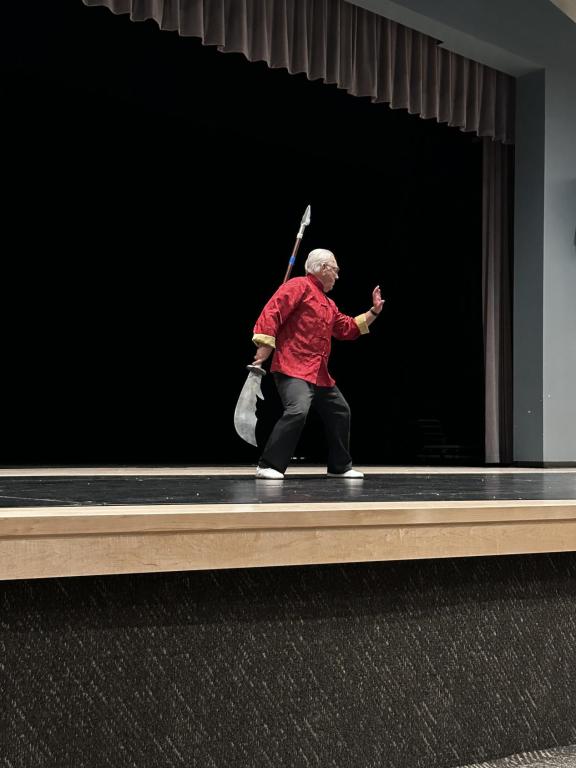 组织高森表演团在Licking Heights当地学校演示中国武器及中国功夫