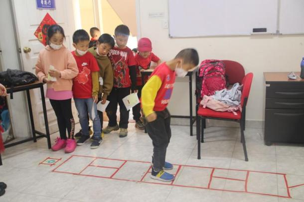 学生体验中国民间传统游戏“跳格子”、“蒙眼敲锣”、“套圈”
