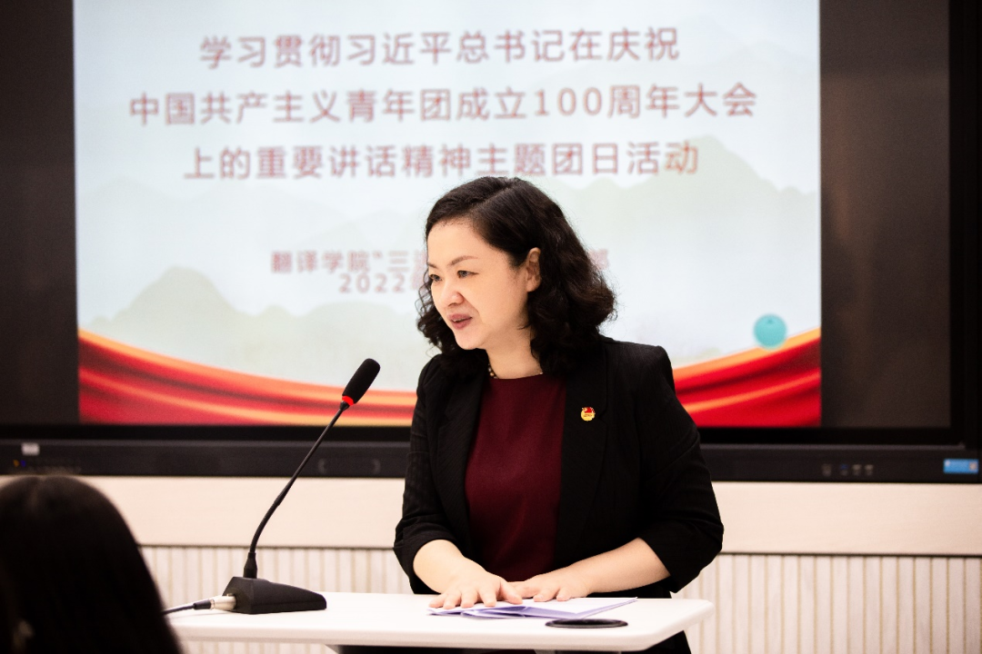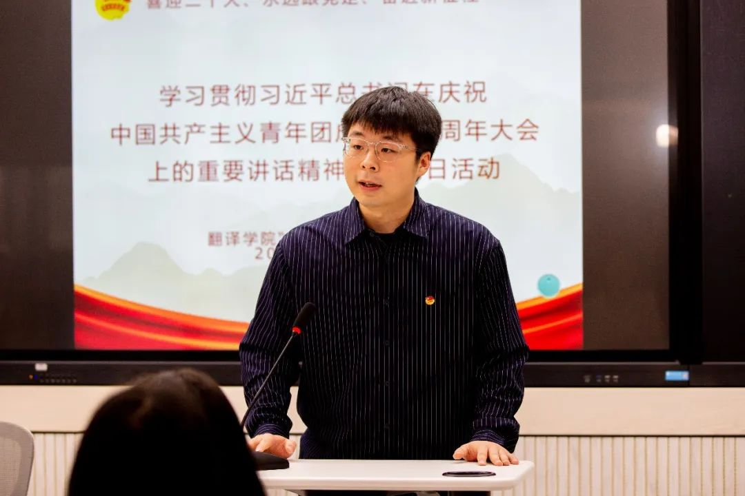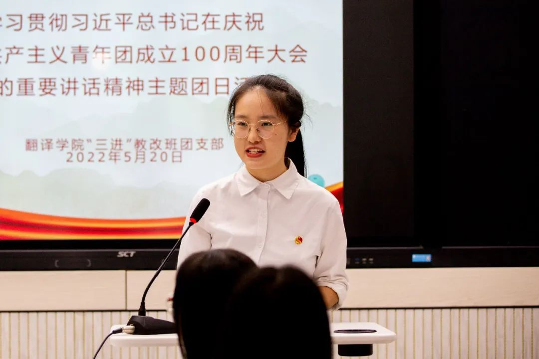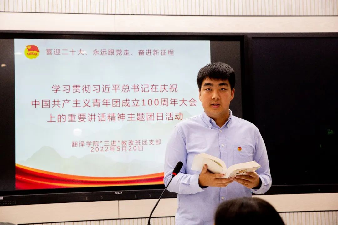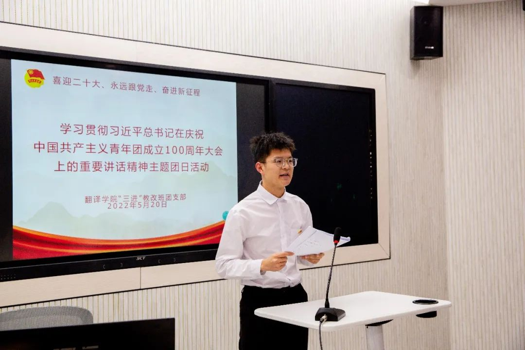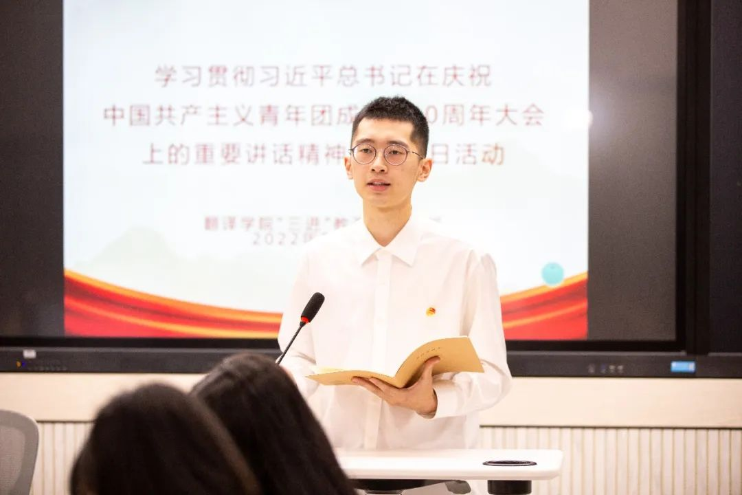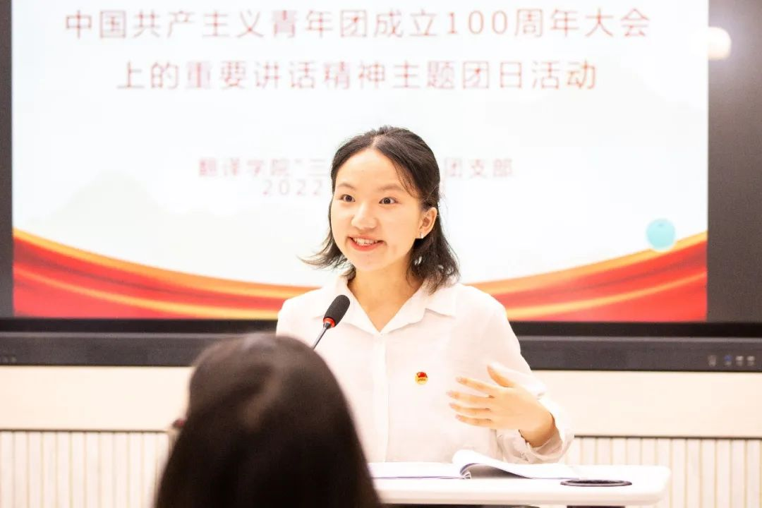 在主题团日活动上,同学们深情诵读《习近平谈治国理政》(第三卷)(英文版)和习近平总书记在庆祝中国共产主义青年团成立100周年大会上的重要讲话(英文版)金句选段,深入交流学习习近平总书记重要讲话精神的心得体会,深度分享参加多语言赛会志愿服务的实践感悟,特别是深刻分析如何准确翻译习近平总书记重要讲话中“国家之魂”“后生可畏”等引经据典内容,把习近平总书记赋予典故鲜活的时代内涵精准翻译出来。