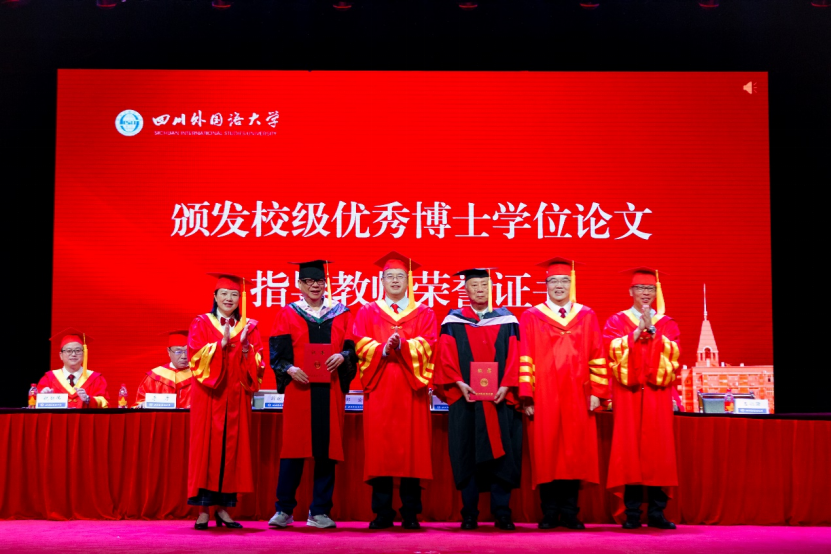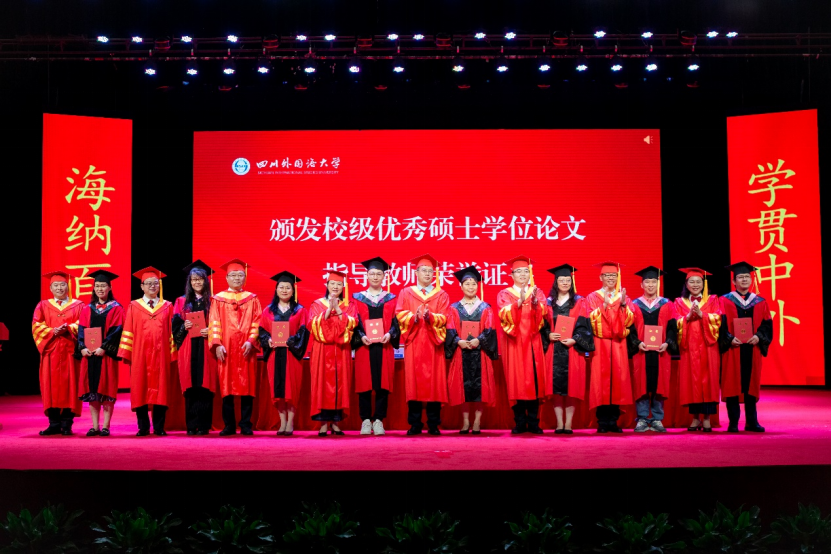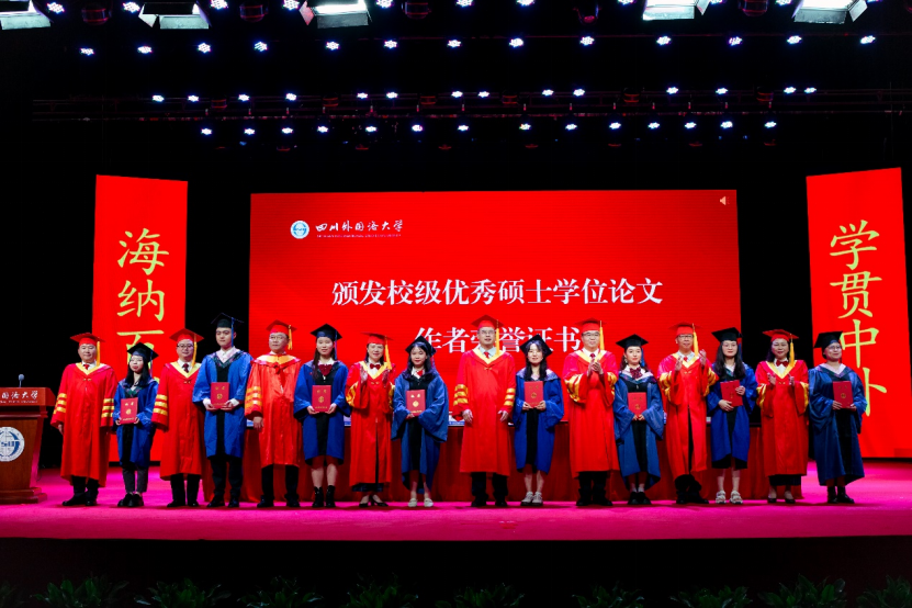 副书记苟朝莉宣读《四川外国语大学关于表彰2022年校级优秀博士、硕士学位论文作者和指导教师的决定》。邹渝、苟朝莉、卢波为2022年校级优秀博士学位论文作者和指导教师颁发荣誉证书;全体校领导为2022年校级优秀硕士学位论文作者和指导老师颁发荣誉证书。