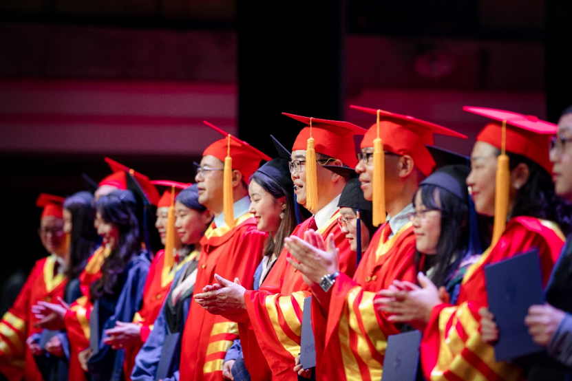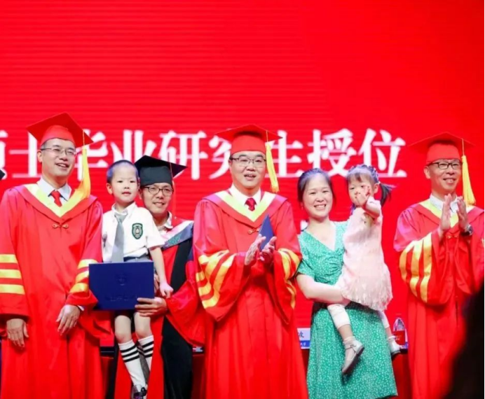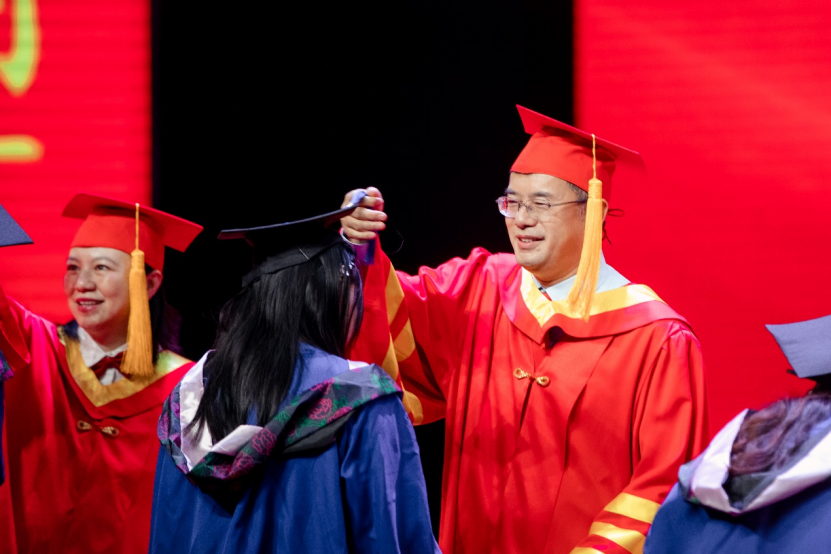 全体校领导向获得博士学位的研究生和获得硕士学位的研究生授位并颁发学位证书,为毕业生拨穗正冠,并合影留念。