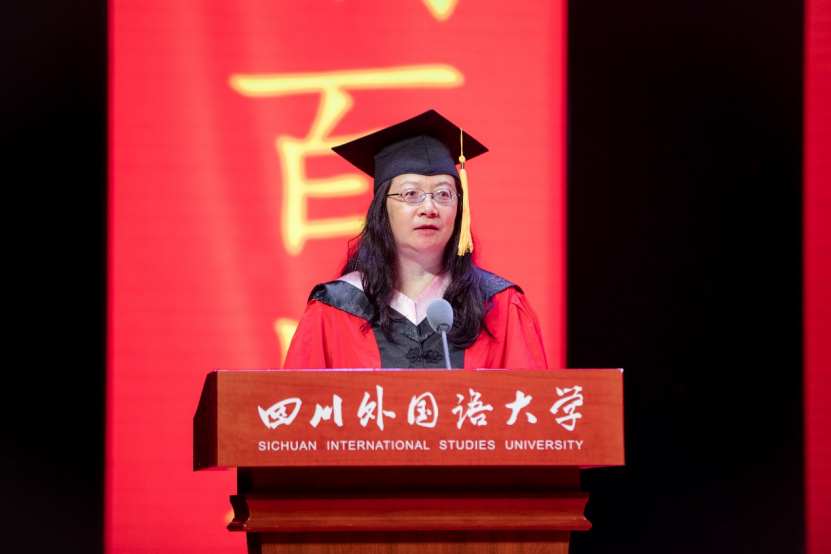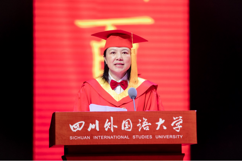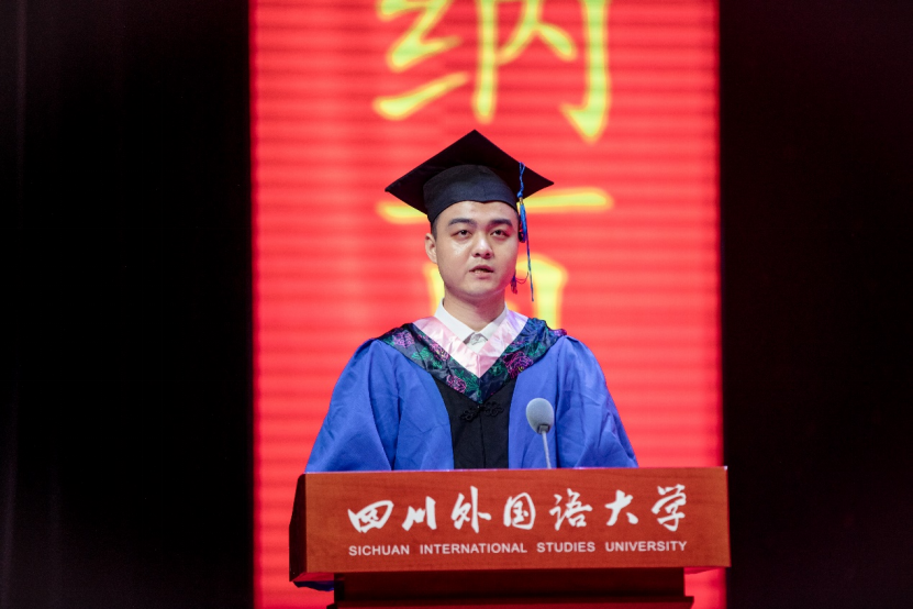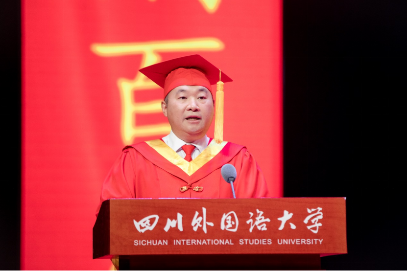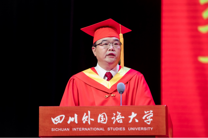一要以理想之灯,照亮时代之路。“希望你们用自己的奉献之声,用自己的担当谱写时代的最强音;希望你们努力成为道德高尚的人、国家有用之才;希望你们珍惜花样年华,去拼搏,去奋斗,去努力,担起青春使命,勇攀时代高峰”。二要铭记校训,身体力行。他解读了川外校训的丰富内涵和对学子的殷切期望:“海纳百川”是川外人“德与行”的追求,“学贯中外”是川外人“才与学”的目标。这一校训凝聚着学校对代代学者的殷切期望。海纳百川,意味着我们有崇高的德行和追求,有兼容并蓄的境界和大气。学贯中外,要求我们要有融通中外文明成果的胸襟和理想。三要学会“做事”与“做人”。新时代的川外研究生要学会“做事”与“做人”:一方面是要把在校园里学到的知识转化为实际工作中解决问题的能力,学会创新性解决问题,学会“做事”;另一方面是要找准自己的人生定位和目标追求,不可以好高骛远,要以正确的价值观处理好个人追求与国家需要的关系,明确自己的目标定位,学会“做人”。理解了“做事”与“做人”的辩证统一关系,方能成为一个有高度的人。四要学会感恩。他叮嘱毕业生:“生活不能只是索取,更要施予。要学会爱人,爱绿草和树荫,爱生活中的点点滴滴,我们要感恩生活,感恩父母。”