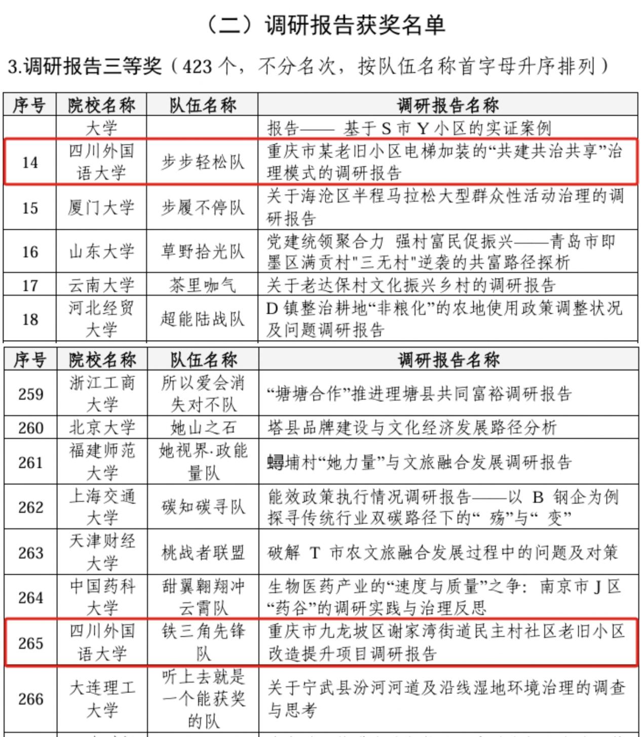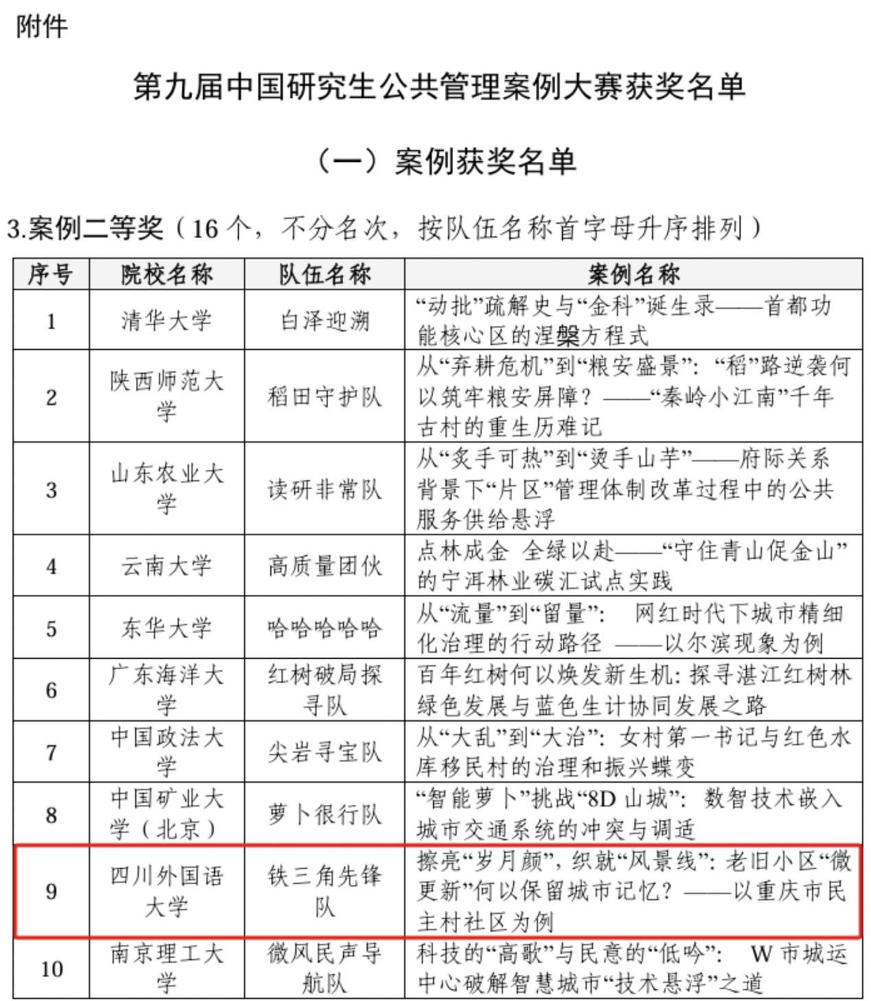 在第九届中国研究生公共管理案例大赛中,我校2023级公共管理研究生“铁三角先锋队”撰写的案例《擦亮“岁月颜”,织就“风景线”:老旧小区“微更新”何以保留城市记忆?——以重庆市民主村社区为例》首次跻身全国32强,并在决赛荣获全国二等奖,同时该队还取得调研报告全国三等奖。2024级公共管理研究生“步步轻松”队撰写的调研报告《重庆市某老旧小区电梯加装的“共建共治共享”治理模式的调研报告》荣获调研报告全国三等奖。