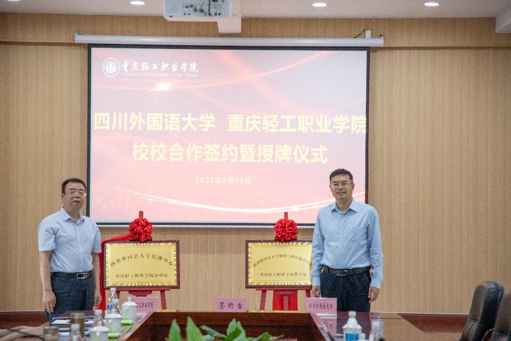 在与会嘉宾的共同见证下,网络与继续教育学院院长杨晓东与重庆轻工职业学院校长贾云签署了战略合作协议;邹渝书记和姚成理事长共同为“四川外国语大学培训中心重庆轻工职业学院分中心”、“四川外国语大学网络与继续教育学院重庆轻工职业学院教学站”揭牌。