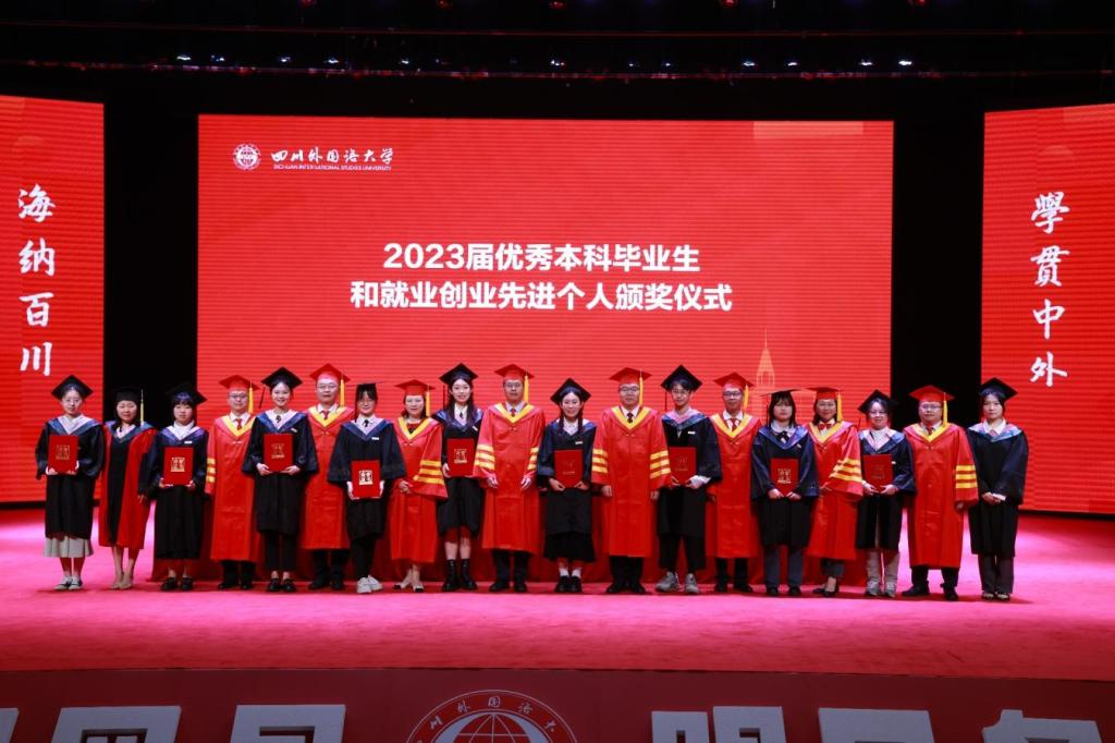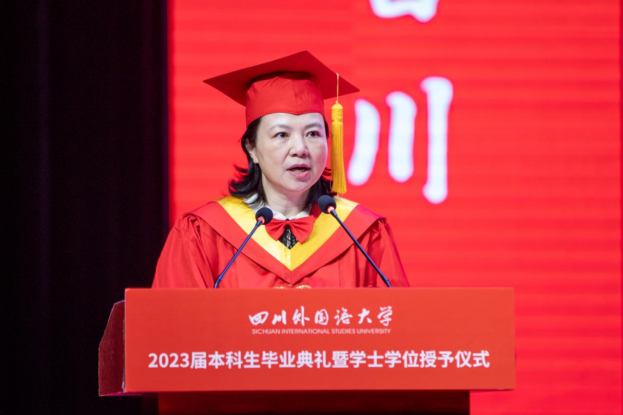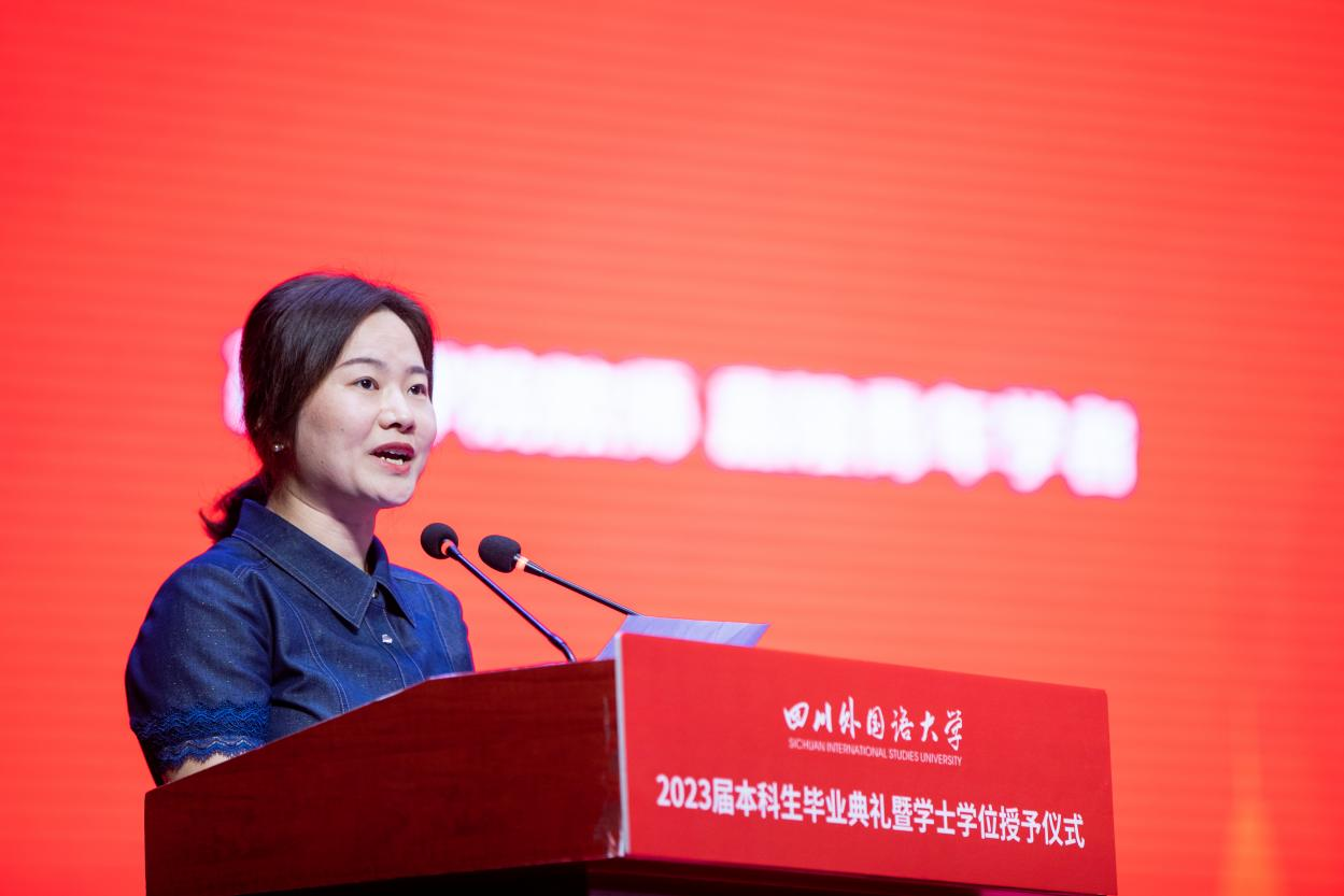 党委副书记苟朝莉宣读《重庆市教育委员会关于对普通高校2023年学生先进个人和先进集体予以表扬的通报》《四川外国语大学关于表彰2023年优秀毕业生的决定》《四川外国语大学关于表彰2023届毕业生就业创业先进个人的决定》。