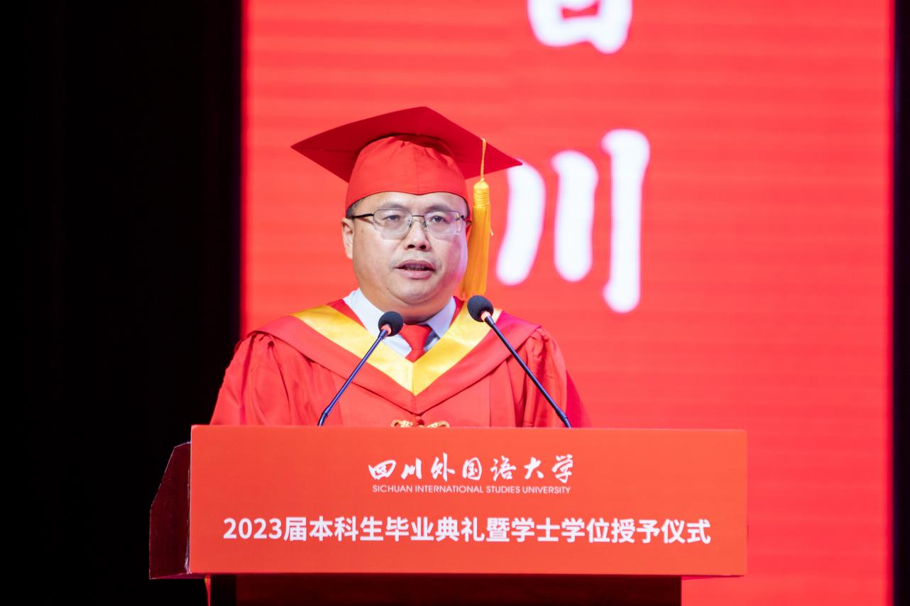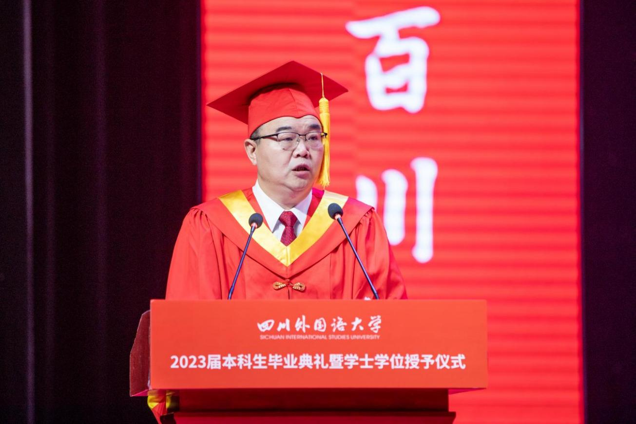 “世界正在经历百年未有之大变局,当前国际格局和国际体系正在发生深刻调整,全球治理体系正在发生深刻变革,国际力量对比正在发生近代以来最具革命性的变化。在这个变局中,时与势在我们这一边,这是我们面临的机遇;但我们同时也面临着守成者的封锁、打压和遏制,这也影响到了大学毕业生的就业、考研、出国等。你们身处这一不可逆的时代洪流,自信自强、不骄不馁、努力圆梦,我看到了你们追梦、筑梦和圆梦路上的精彩华章。” 校长董洪川在讲话中对2023届毕业生刻苦勤奋、爱校荣校、充满家国情怀给予了高度赞扬。他以“立大志、守初心、得智慧”这人生三重境界作为临别赠言,寄予对毕业生的期望:一是“立大志”下决心,不断跋涉、不懈追求。他希望新时代青年要以开放的心态和胸怀去拥抱新技术、融入新时代,在学中做、在做中学,定能让你游刃有余、获得新突破。二是“守初心”耐寂寞,执着目标、执着进取。希望同学们好好地规划自己的人生之路,从慎独开始起步,持续深耕,保持定力,敢于创新、善于创新,在新的环境中、新的岗位上书写自己的精彩人生。三是“得智慧”平心境,潜心浇灌、潜心问道。希望同学们以书为伴、以书为舟,跨越人生的烟波浩渺,达到“得智慧”的境界。他也在讲话中抒发了对毕业生们的依依不舍与深深祝福:“你们终将远行,漫漫道路在脚下、深深情谊在心间,希望你们在《青春的书》中继续续写人生之所立、人生之所守、人生之所得,母校SISU永远守候你们成功的讯息!”