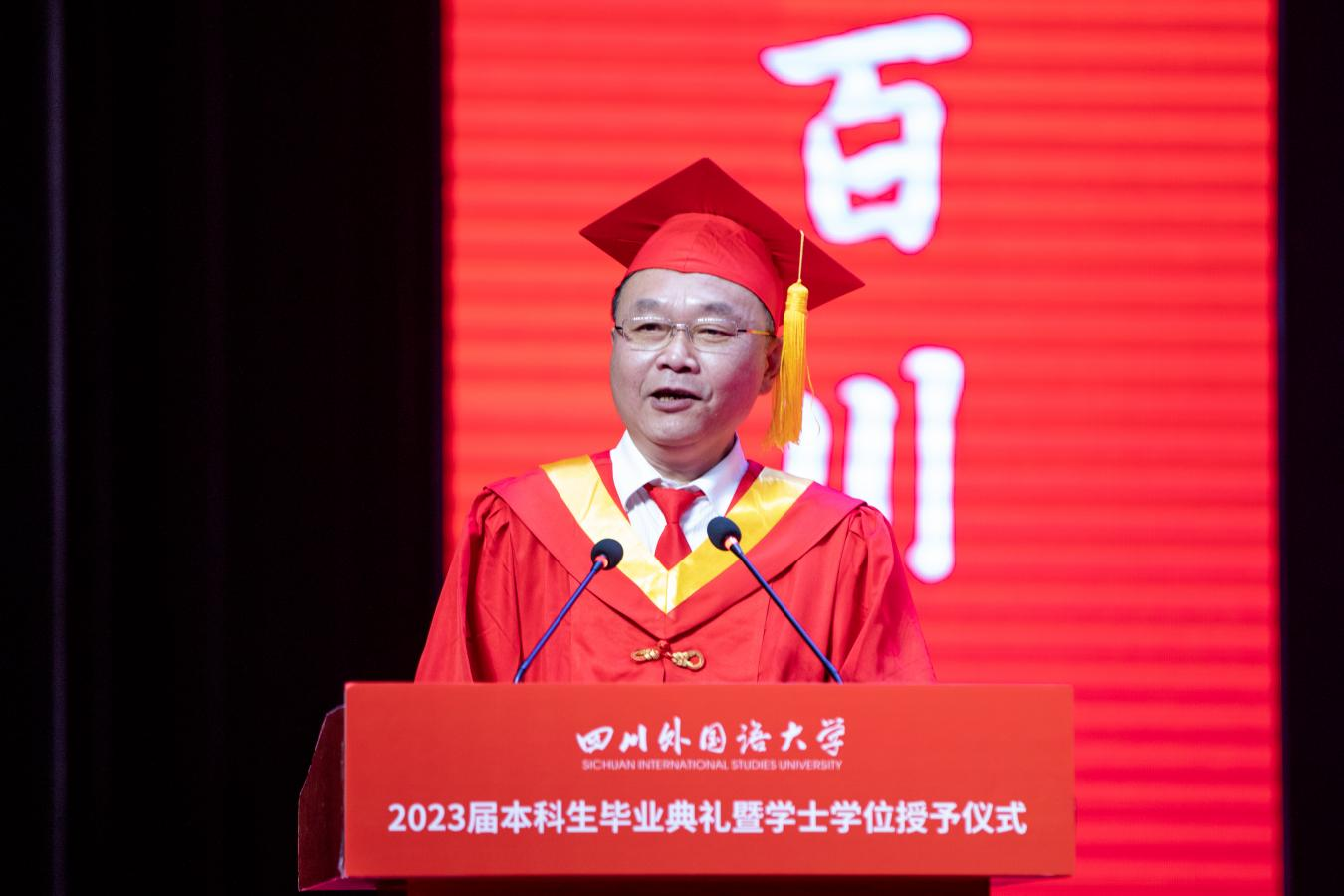副校长严功军宣读《四川外国语大学关于授予2023届张乐萌等3248名学生学士学位的决议》。