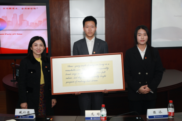 最后,亓淑婷代表全体同学向重庆理工大学团委书记龙婷老师献上了“当代中国青年生逢其时,施展才干的舞台无比广阔,实现梦想的前景无比光明”的英文书法作品。我校团委书记陈派老师向2022级金融教改班同学们赠送了《习近平谈治国理政》第一卷至第四卷英文版,希望同学们要认真学习习近平新时代中国特色社会主义思想,做到学以致用、用以促学,理论联系实际,做新时代坚定有为的青年马克思主义者。