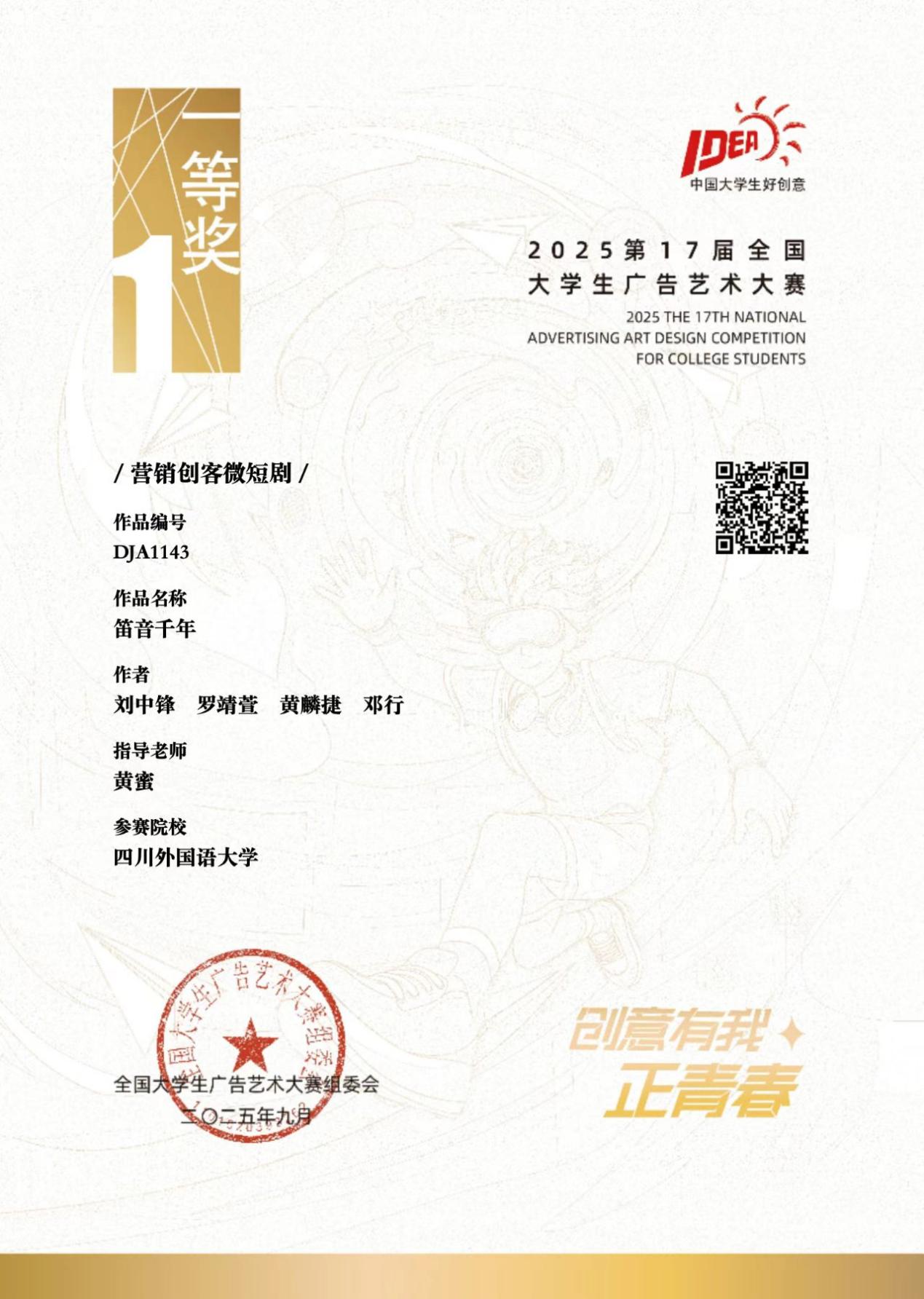 在营销创客类赛道,新闻传播学院共有3件作品获奖。其中,刘中锋、罗靖萱、黄麟捷、邓行同学在今年首次增设的微短剧类别中,凭借《笛音千年》(共20集)和《念念不忘》两部作品(指导老师:黄蜜)荣获全国一等奖。刘中锋还在8月26日于西安获得“优秀编剧”奖,此奖项全国仅5人。此外,陈罗雨晗、王语萱、陈纪宇、鲁景文、万雨欣同学的微短剧《寻找!百工卡》(指导老师:何双百、郭羿辰)获全国二等奖;袁青青、游璐希、勾彬竹同学的微视频(指导老师:杨成杰)获全国优秀奖。